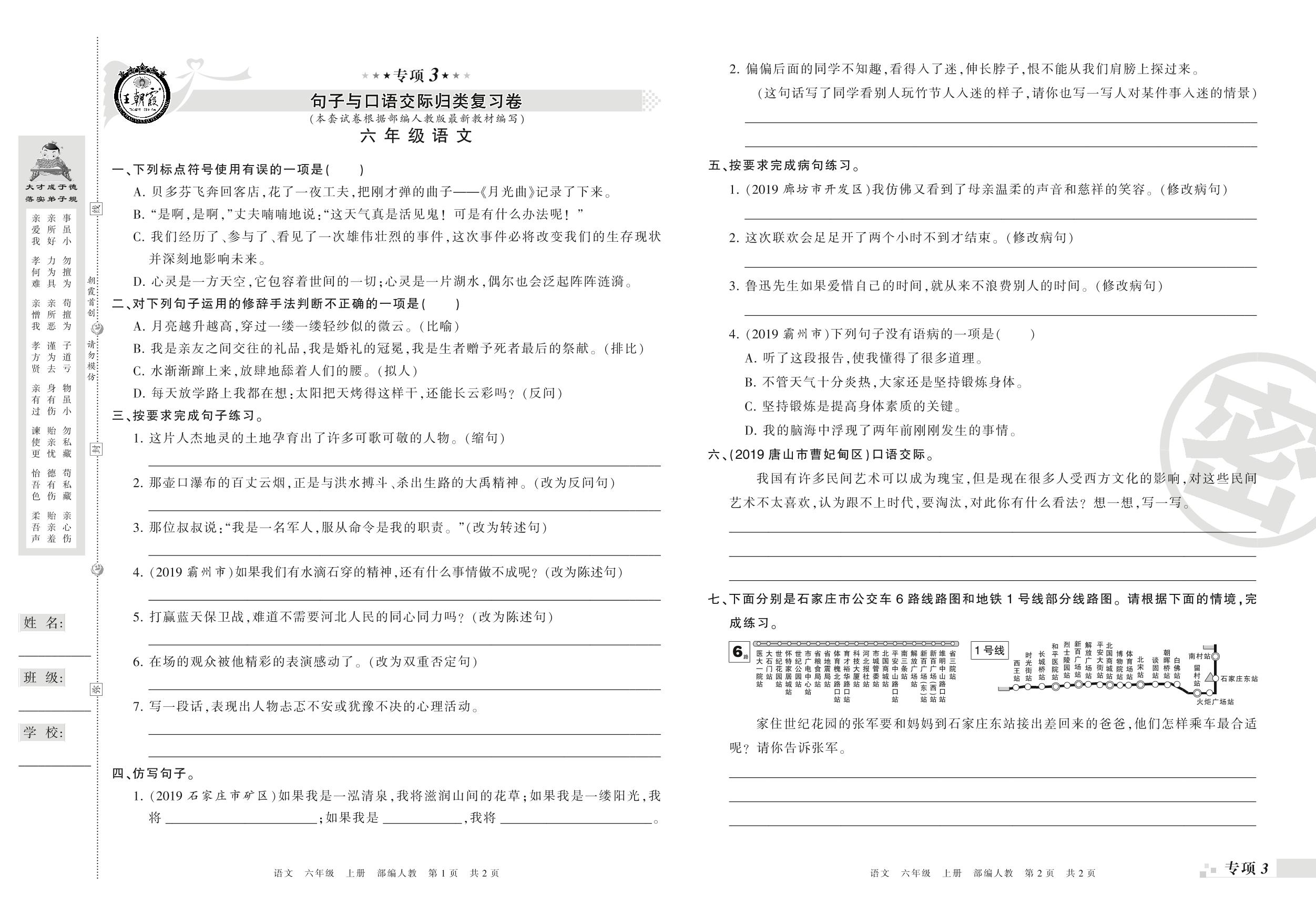 王朝霞期末专项卷——句子与口语交际、课文内容归类复习六年级上册语文(人教版)_R21080234943【0】
