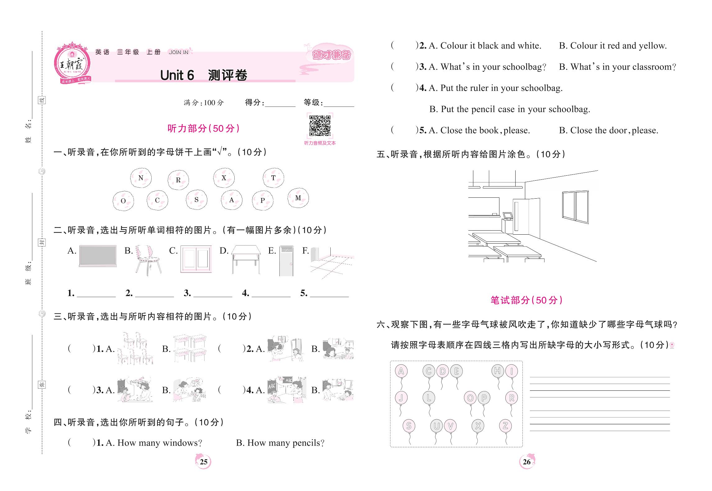 2022上册三年级英语剑桥版 Unit 6 测评卷