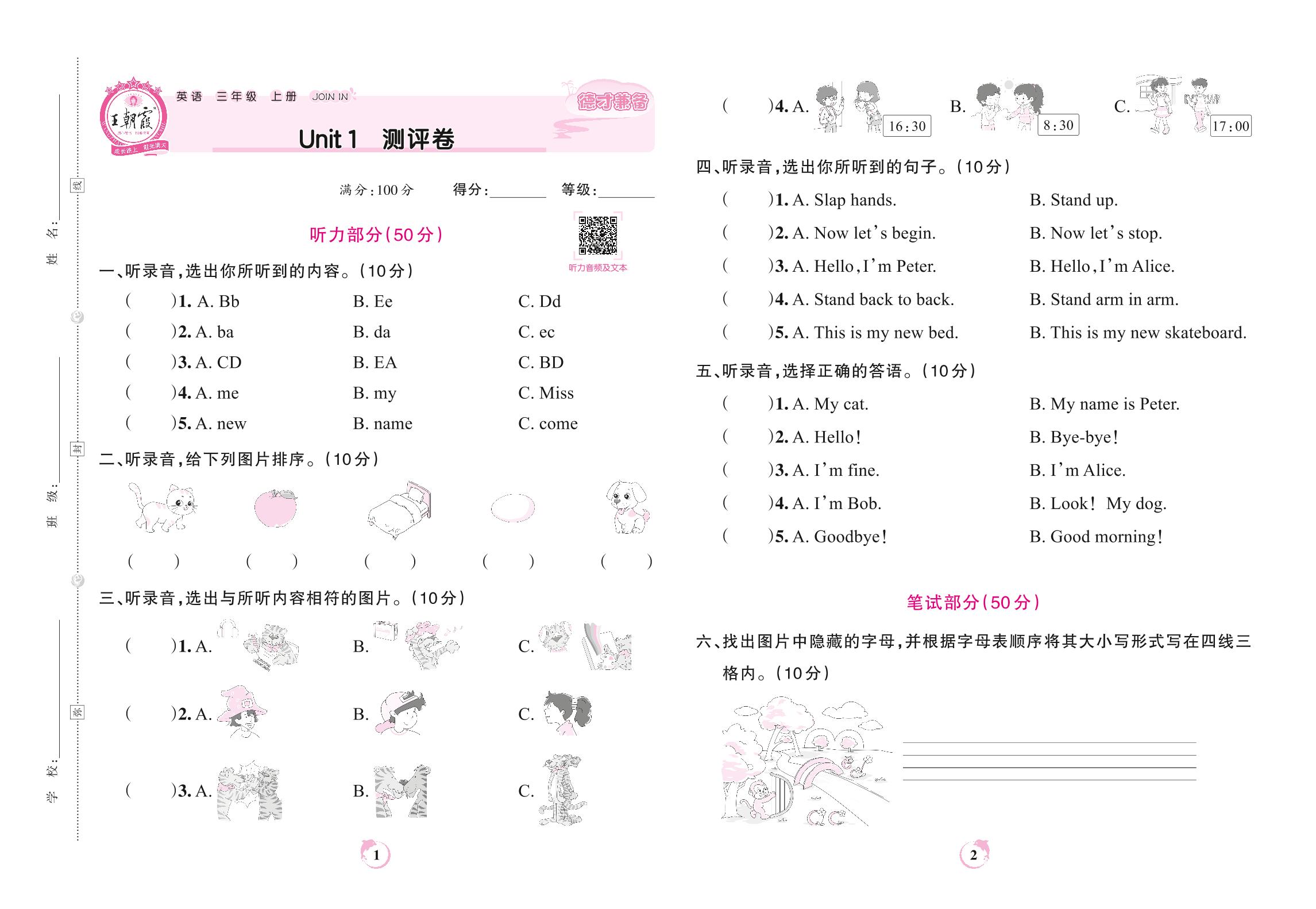 2022上册三年级英语剑桥版 Unit 1 测评卷