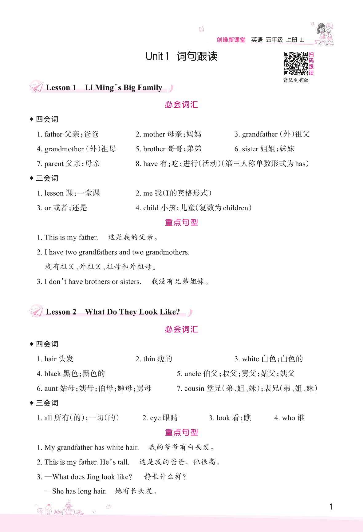 2022上册五年级英语冀教版 Unit 1 My Family—词句跟读