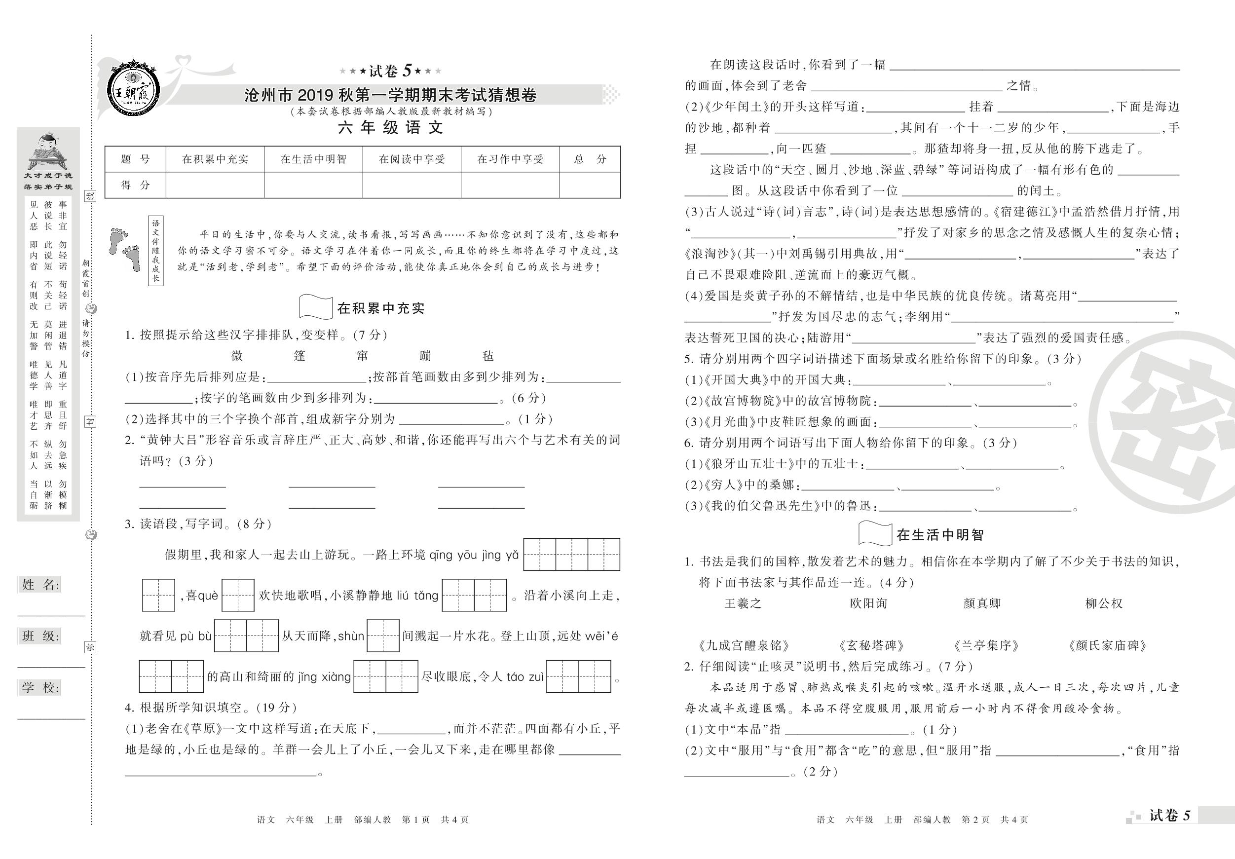 2019-2020学年第一学期沧州市猜想卷六年级语文试卷(人教版)【5】