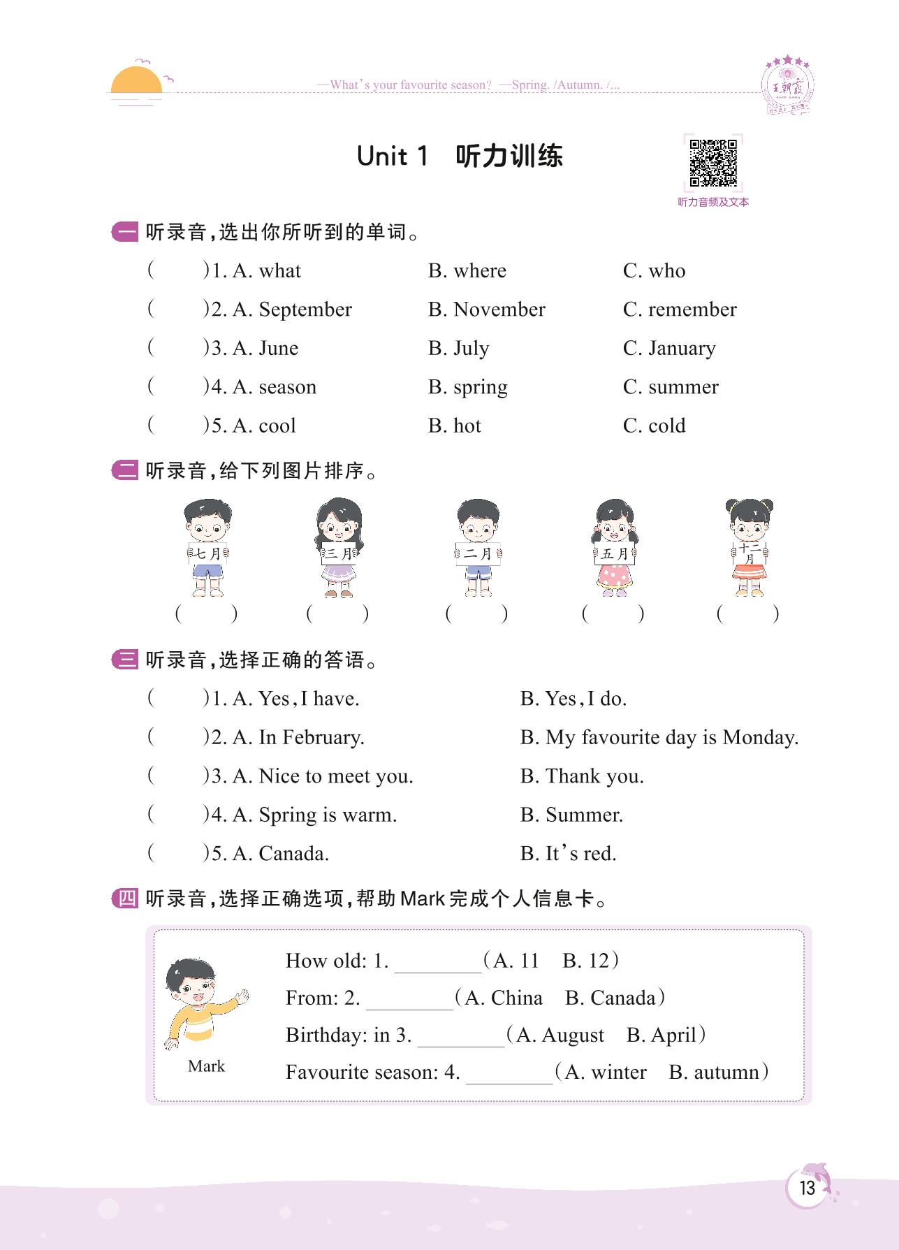 2022上册四年级英语剑桥版 Unit 1 听力训练