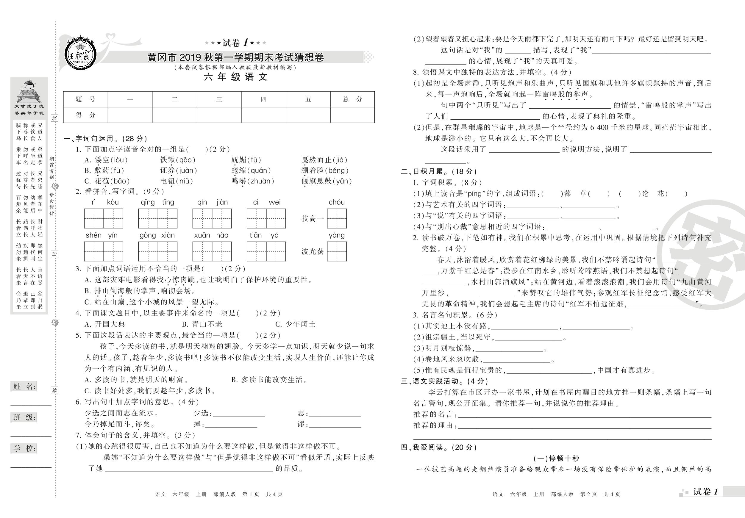 2019-2020学年第一学期黄冈市猜想卷六年级语文试卷(人教版)【1】