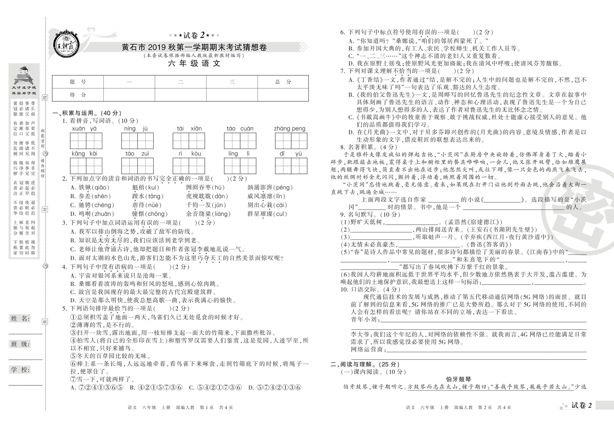 2019-2020学年第一学期黄石市猜想卷六年级语文试卷(人教版)【2】