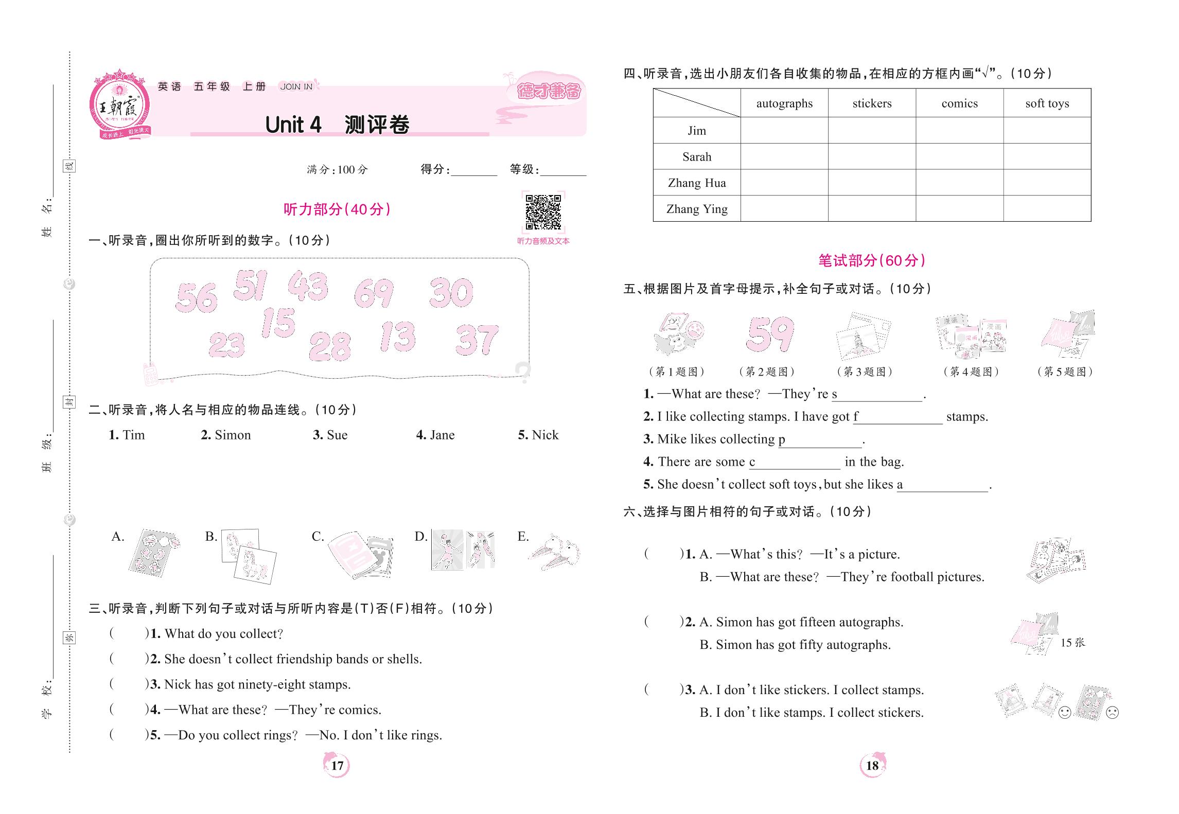 2022上册五年级英语剑桥版 Unit 4 测评卷