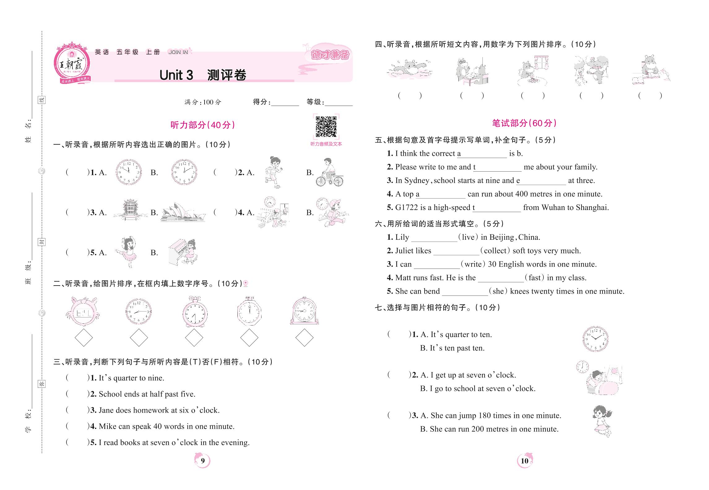 2022上册五年级英语剑桥版 Unit 3 测评卷