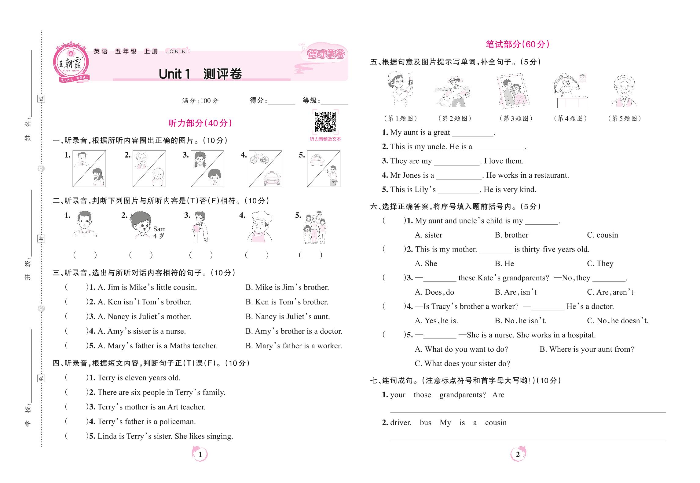 2022上册五年级英语剑桥版 Unit 1 测评卷