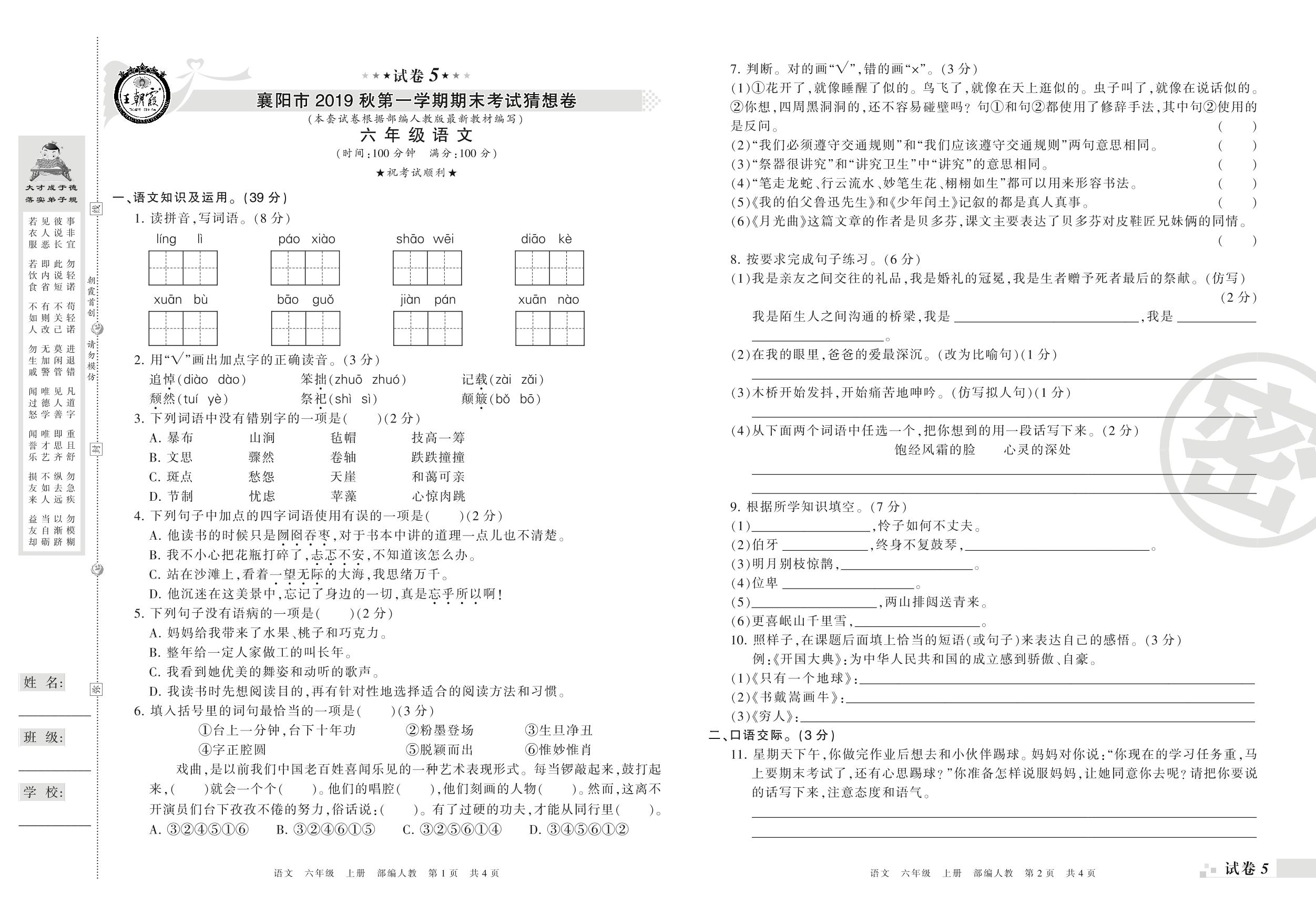 2019-2020学年第一学期襄阳市猜想卷六年级语文试卷(人教版)【5】