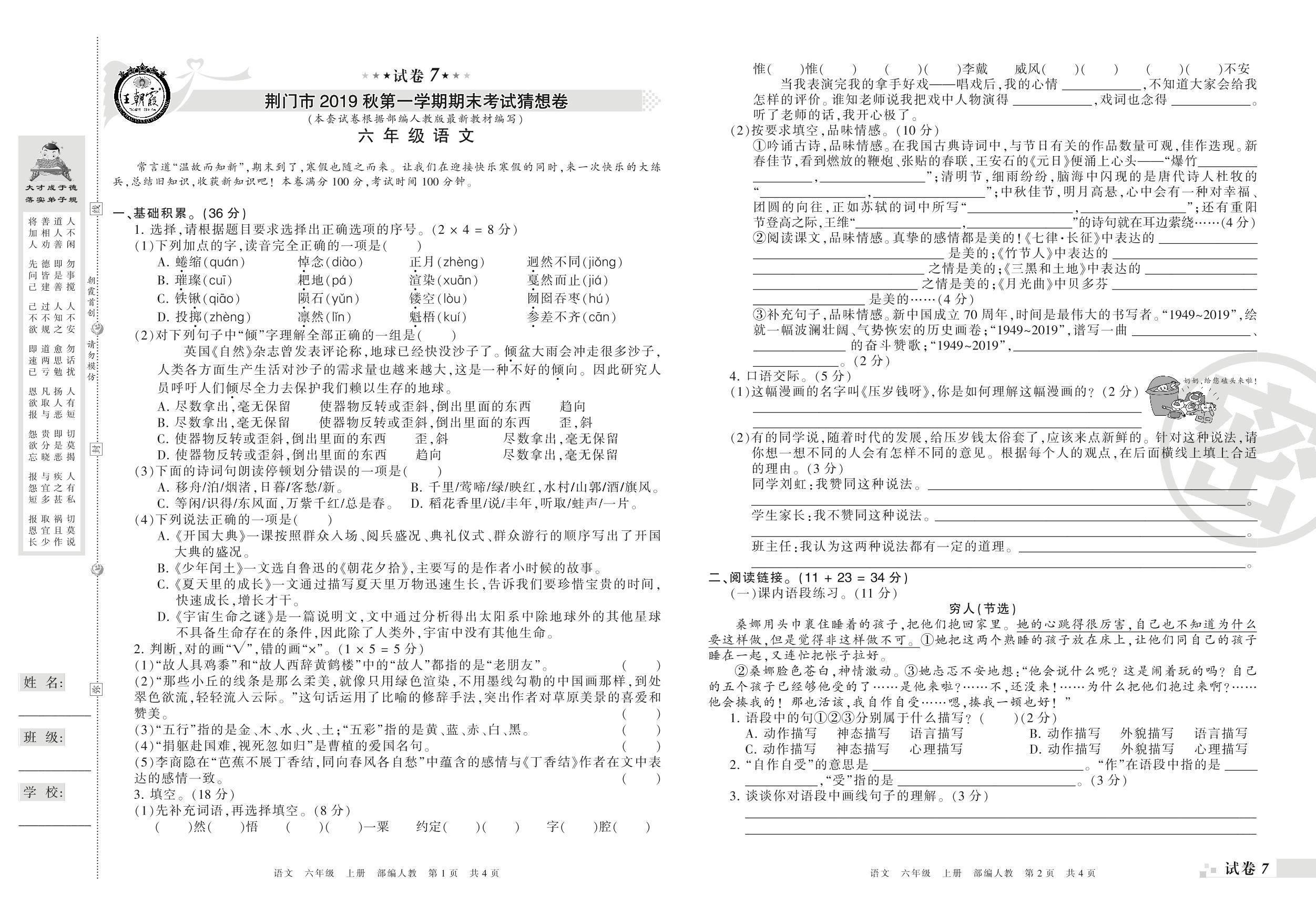 2019-2020学年第一学期荆门市猜想卷六年级语文试卷(人教版)【7】