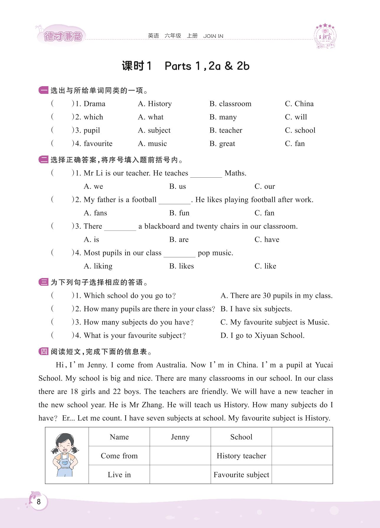 2022上册六年级英语剑桥版 Unit 1—课时 1 Parts 1,2a & 2b