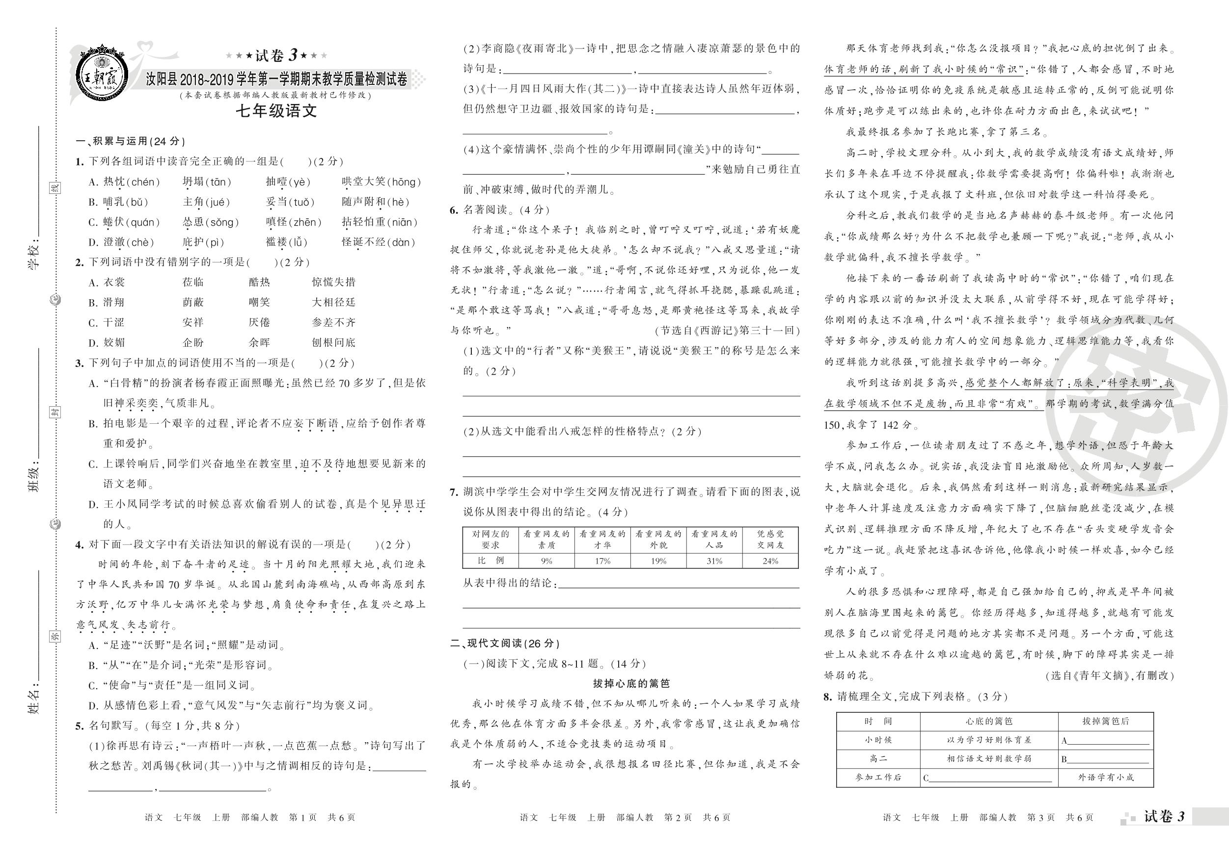 2018-2019学年第一学期洛阳市汝阳县七年级语文试卷(人教版)【3】