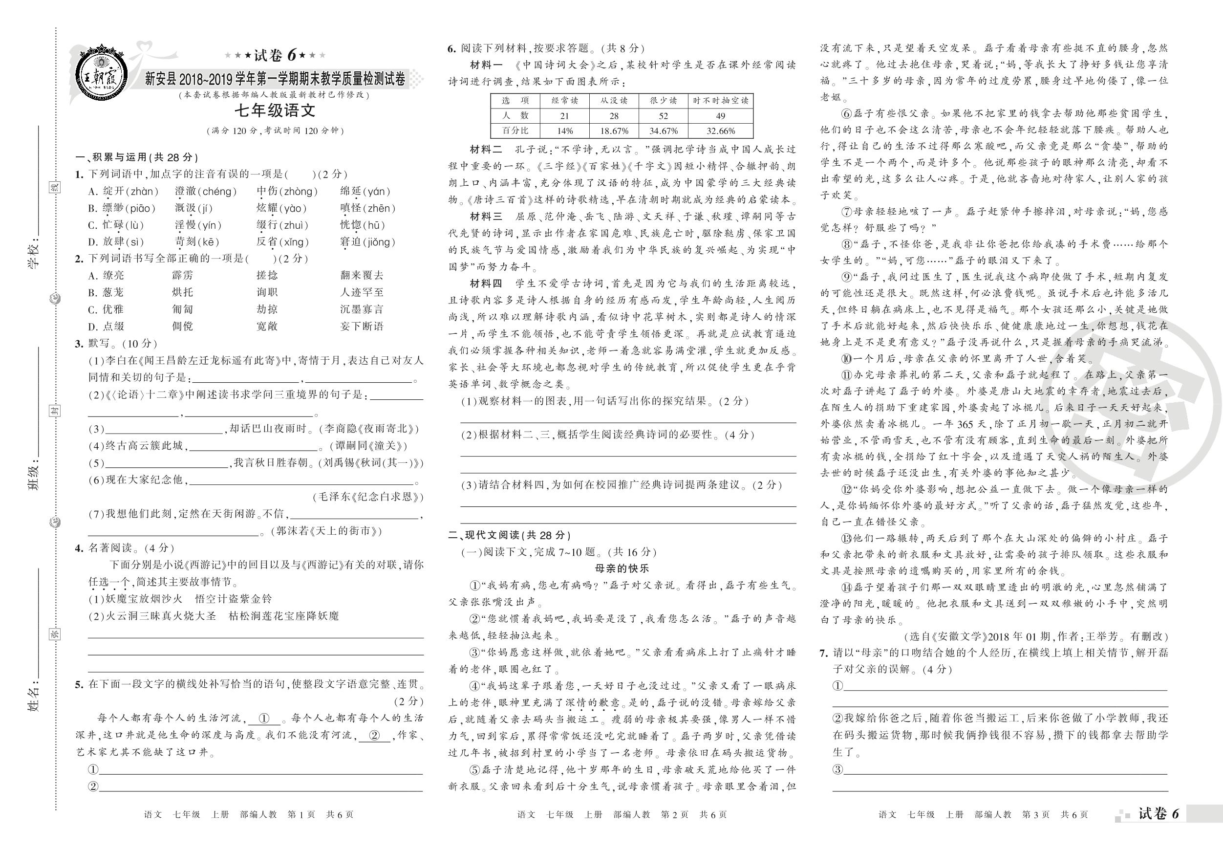 2018-2019学年第一学期洛阳市新安县七年级语文试卷(人教版)【6】