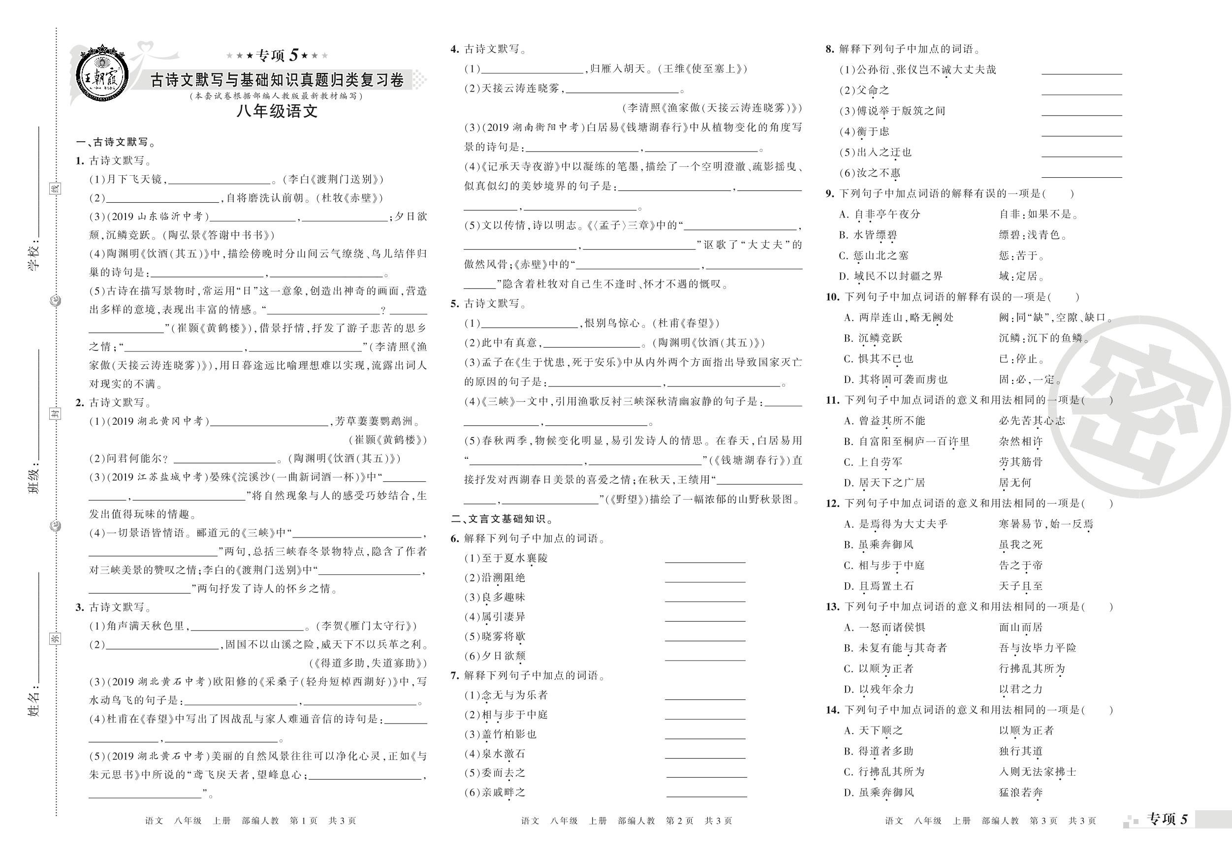 王朝霞期末专项卷——古诗文默写与基础知识、课内文言文阅读真题归类复习八年级上册语文(人教版)_R21080235418【0】