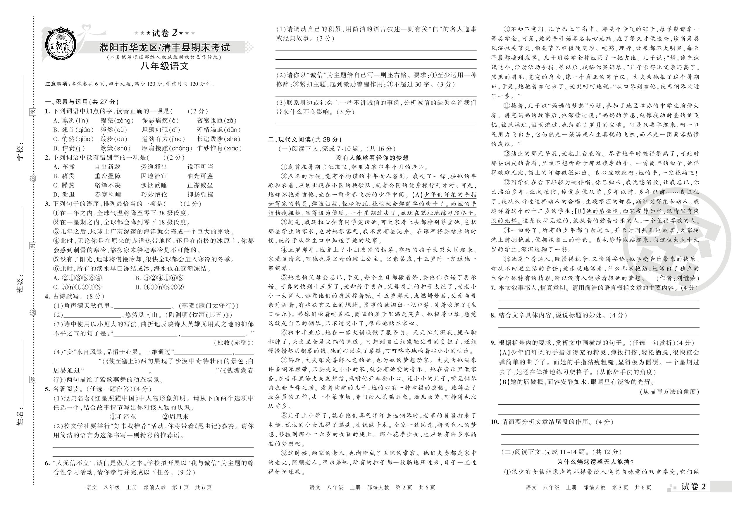 2018-2019学年第一学期濮阳市华龙区(清丰县)八年级语文试卷(人教版)【2】