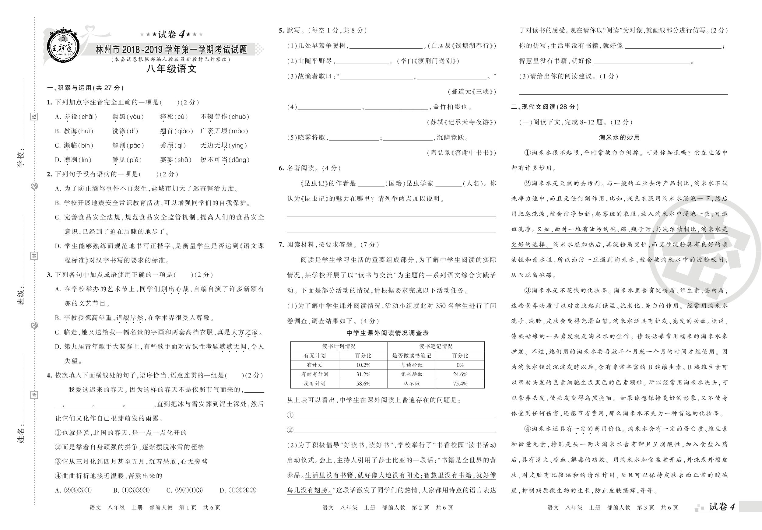 2018-2019学年第一学期林州市八年级语文试卷(人教版)【4】