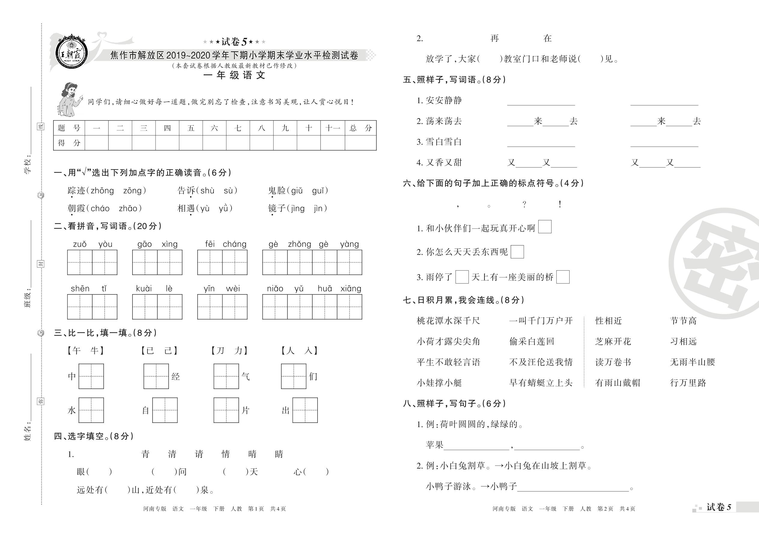 2019-2020学年第二学期焦作市解放区一年级语文试卷(人教版)【5】
