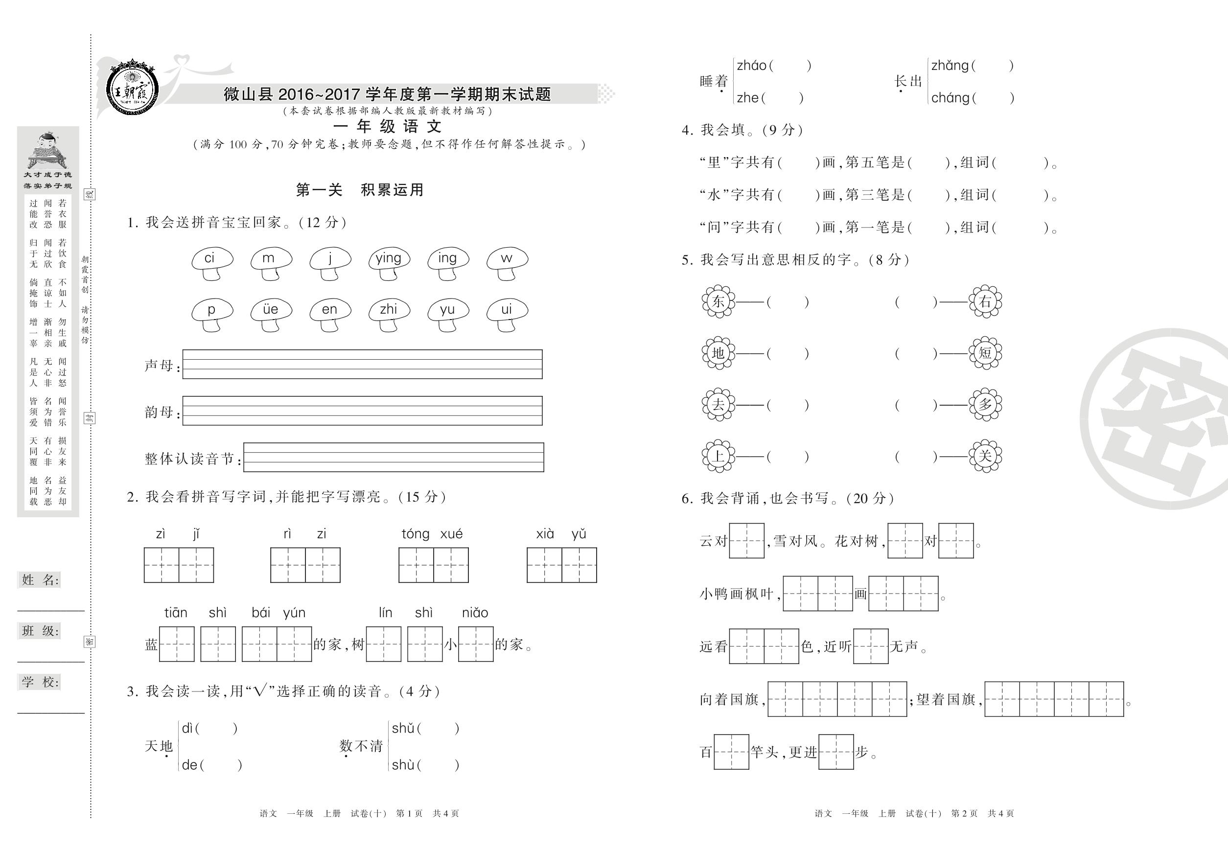 一年级语文人教版上册期末卷