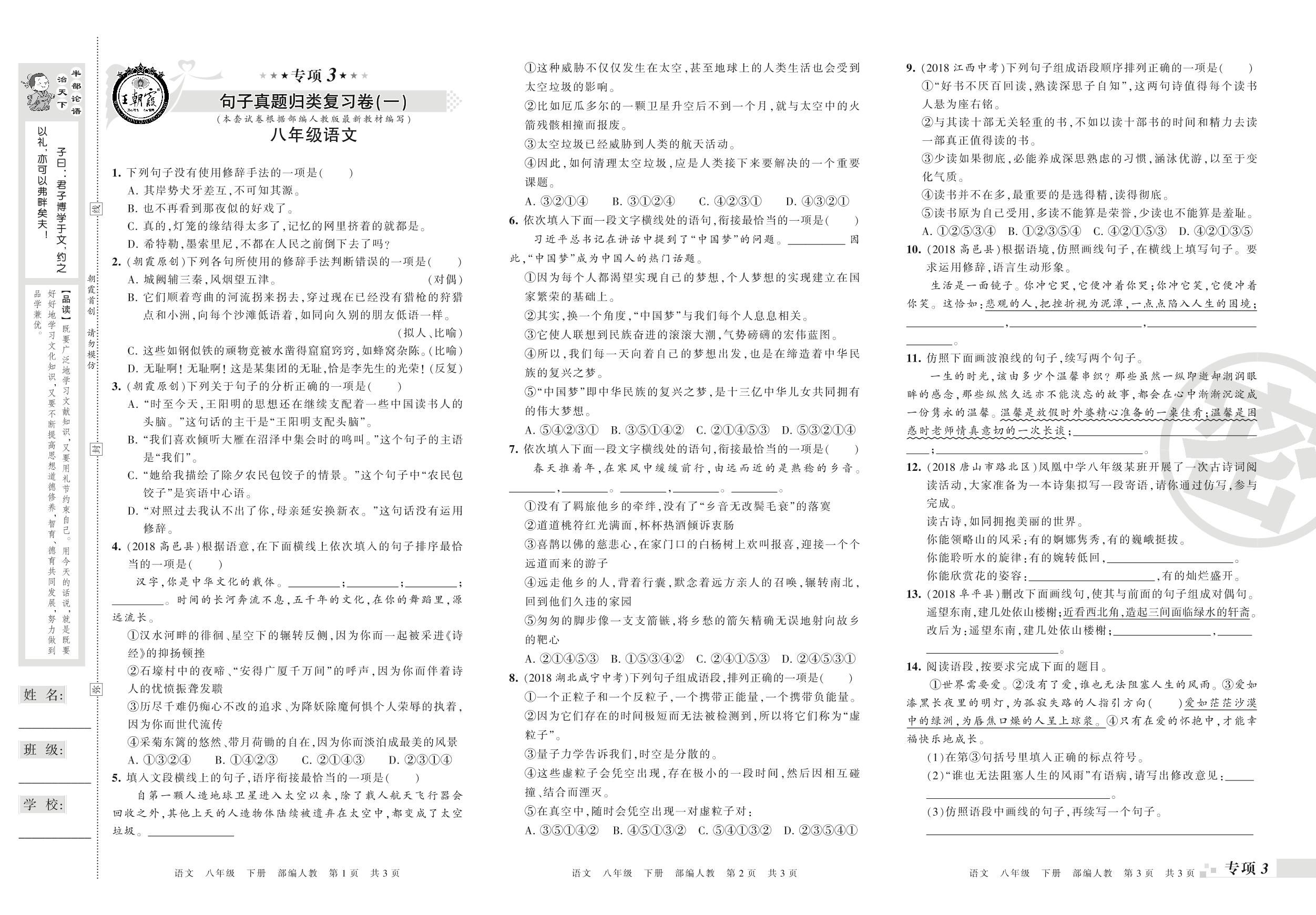 王朝霞期末专项卷——句子(一)(二)真题归类复习卷八年级下册语文(人教版)_R21080235737【0】