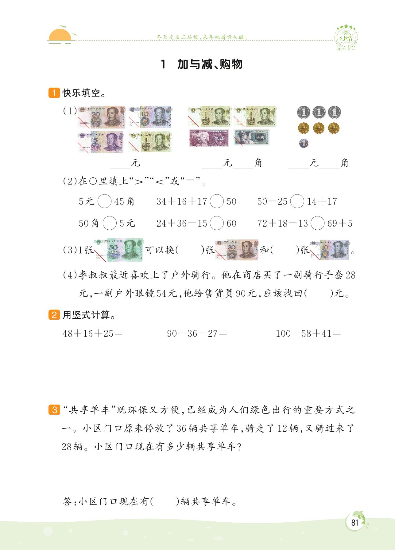 2022上册二年级数学北师版 总复习——1 加与减、购物