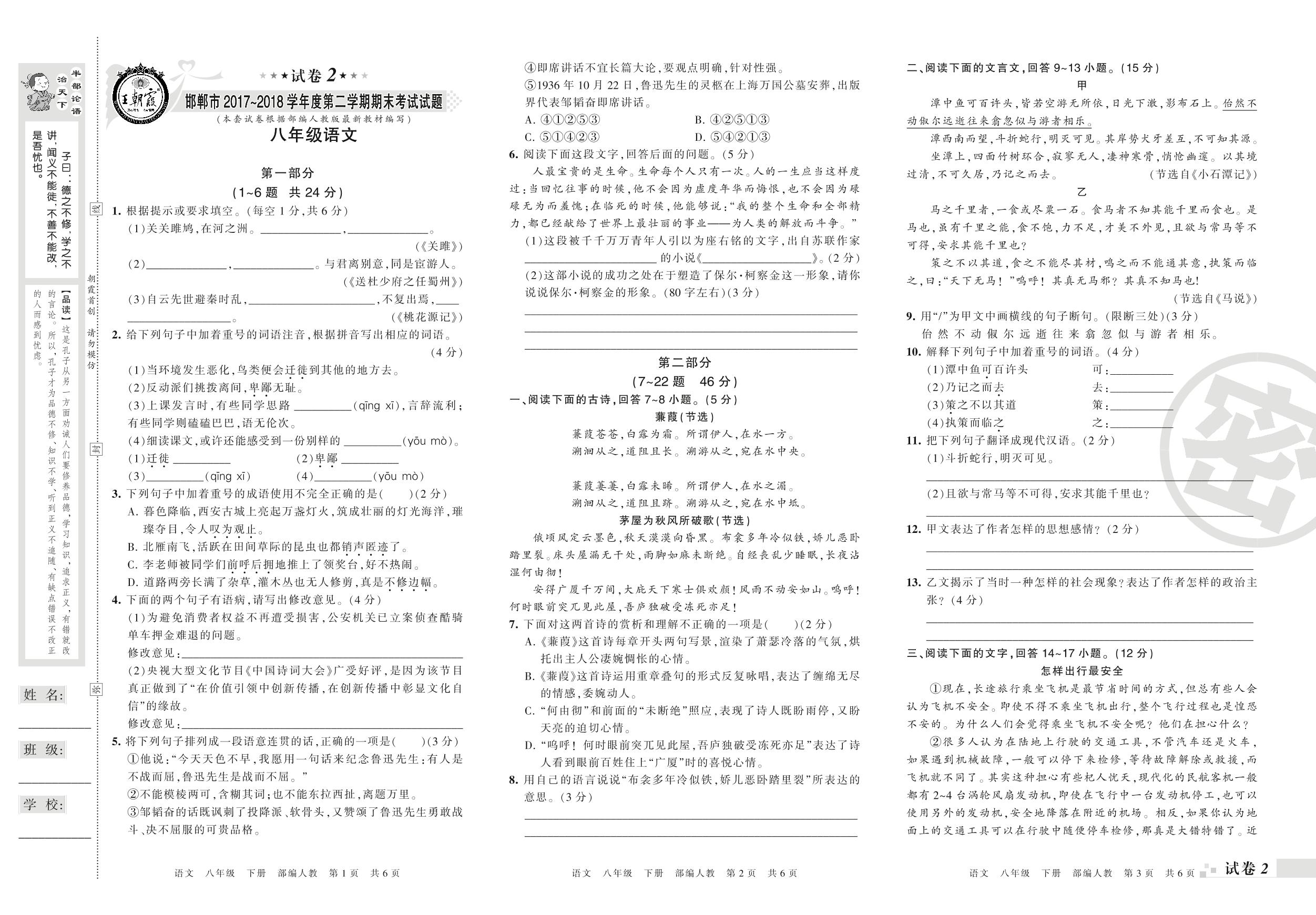 2017-2018学年第二学期邯郸市八年级语文试卷(人教版)【2】