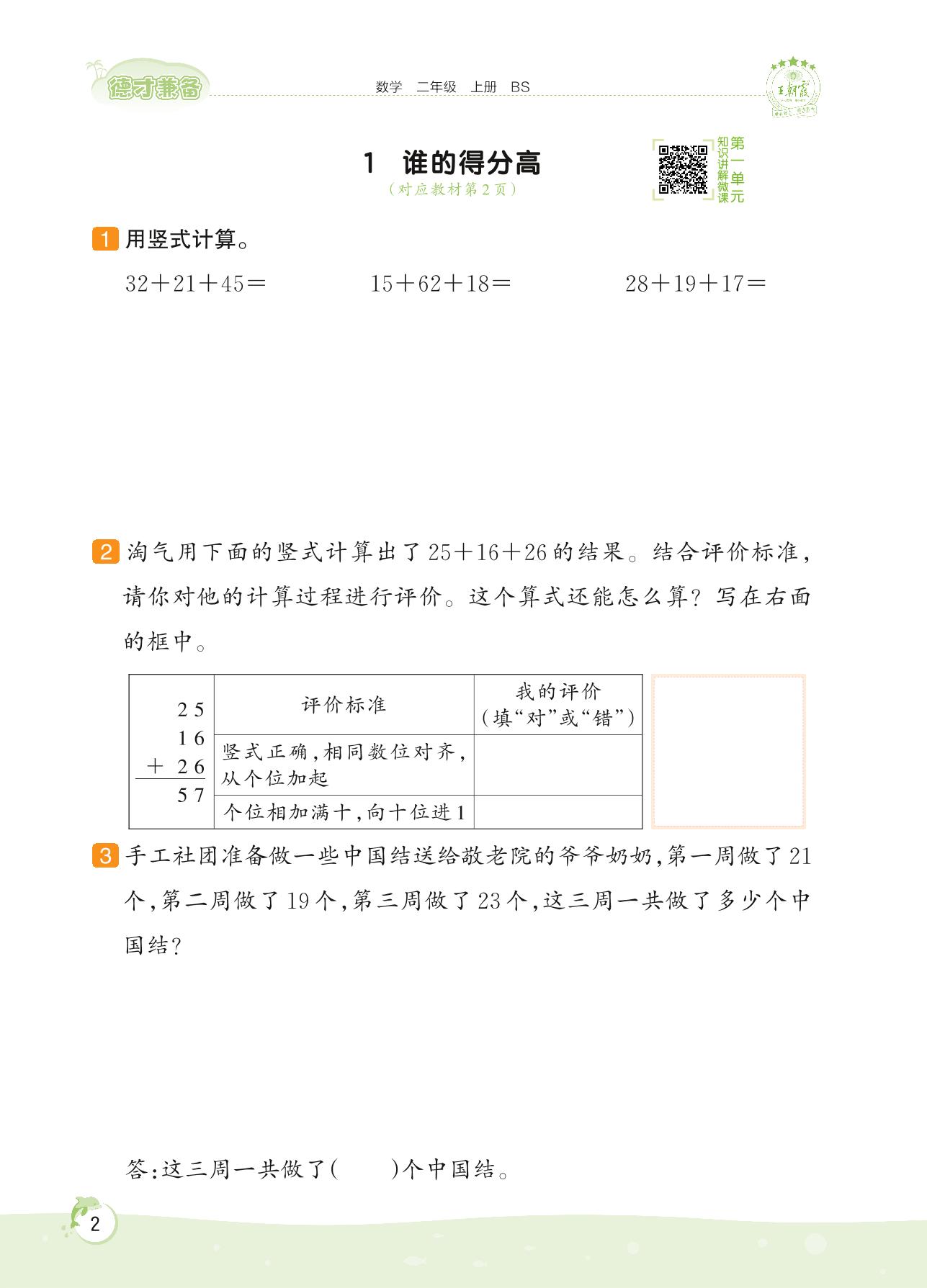 2022上册二年级数学北师版 第一单元 加与减——1 谁的得分高