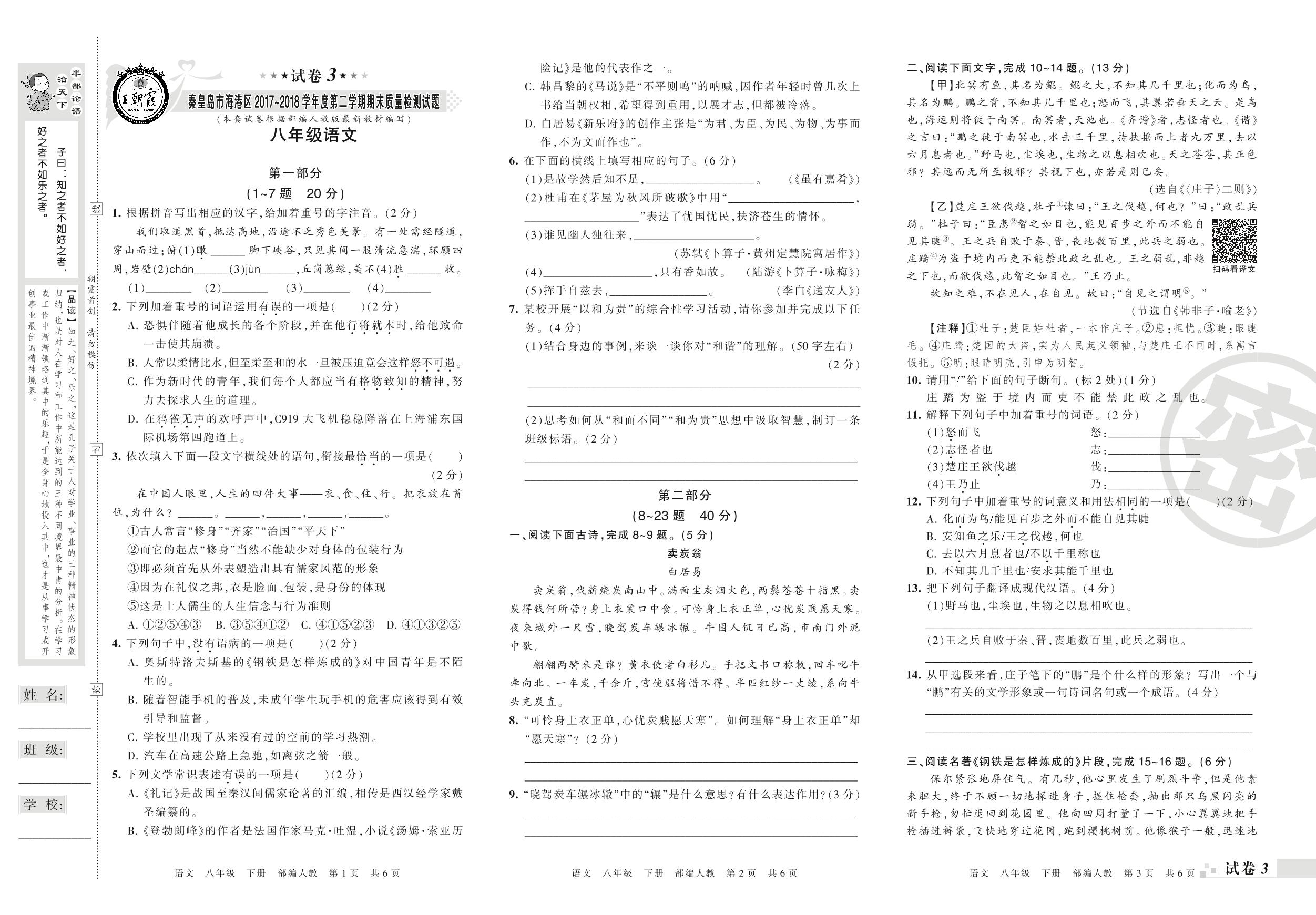 2017-2018学年第二学期秦皇岛市海港区八年级语文试卷(人教版)【3】