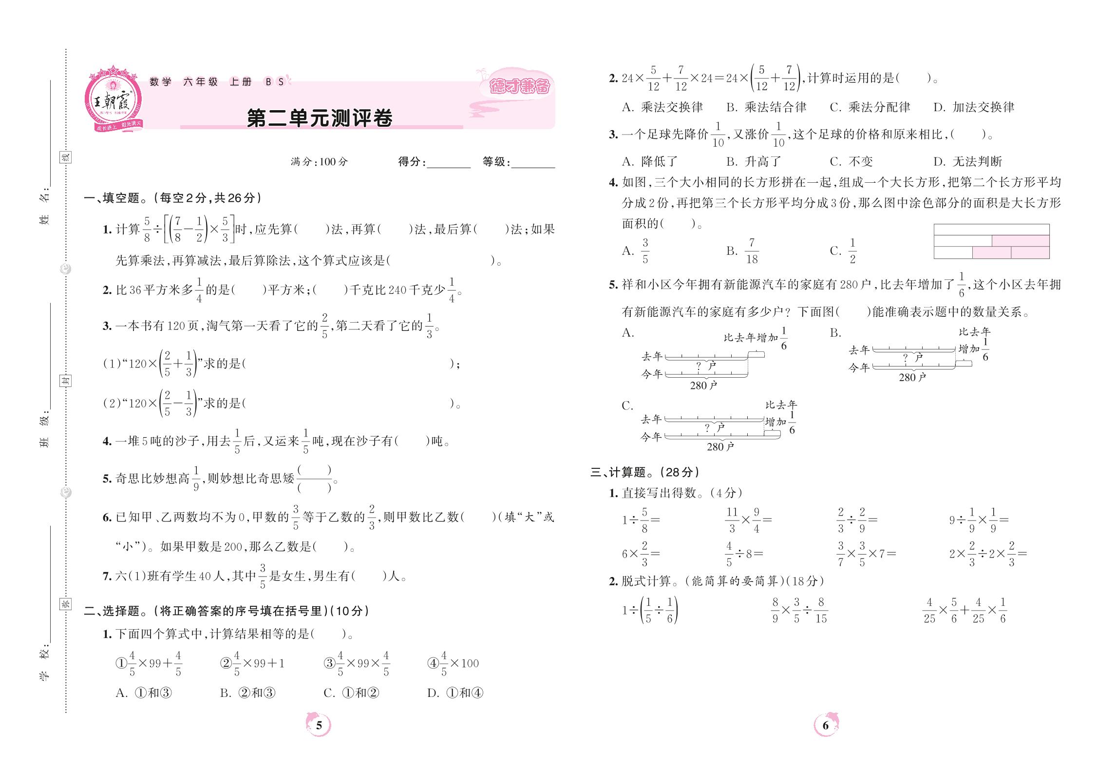 2022上册六年级数学北师版 第二单元测评卷