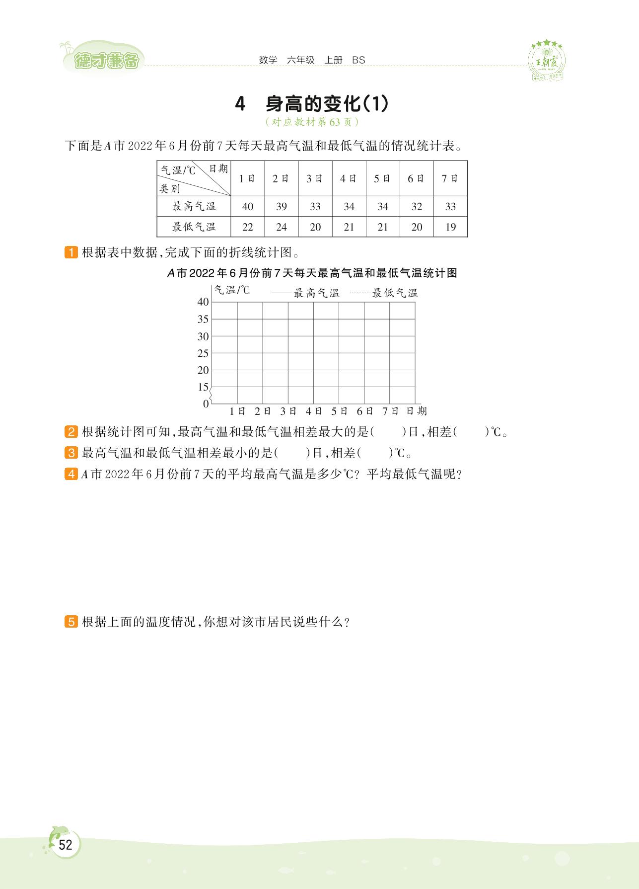 2022上册六年级数学北师版 第五单元 数据处理——4 身高的变化(1)
