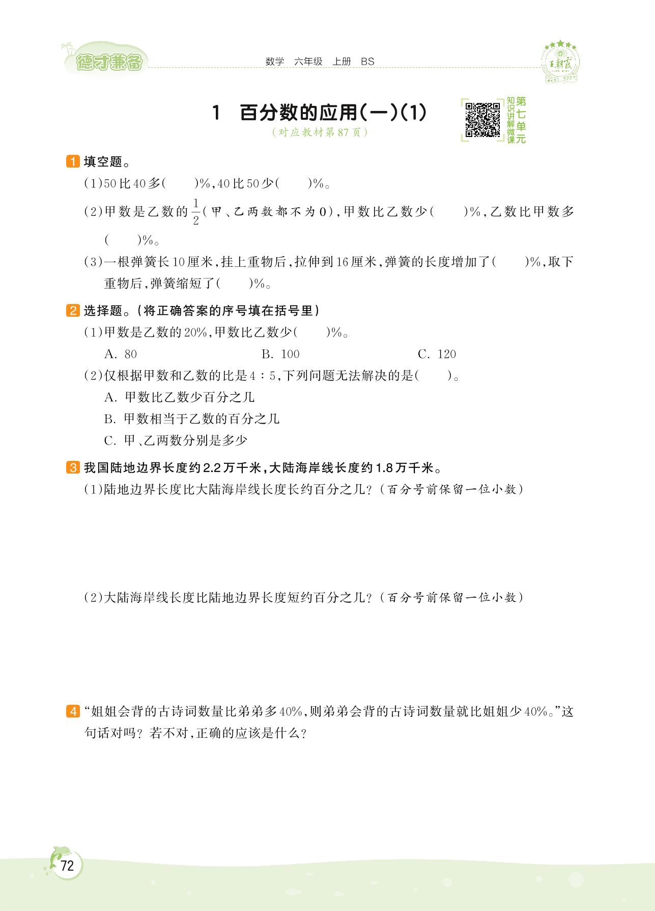 2022上册六年级数学北师版 第七单元 百分数的应用——1 百分数的应用(一)(1)