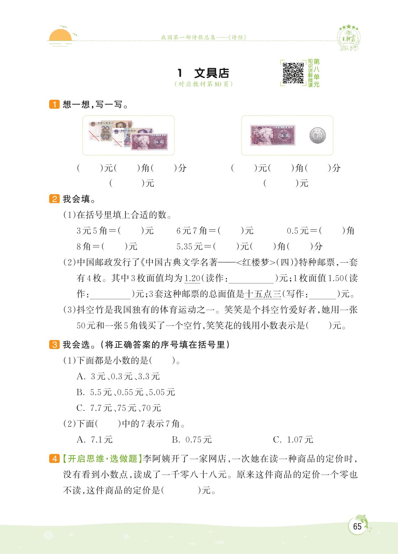 2022上册三年级数学北师版 第八单元 认识小数——1 文具店