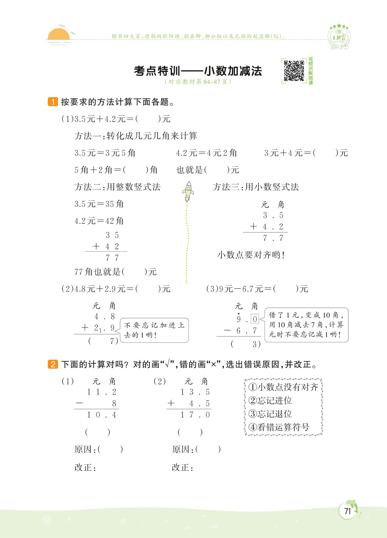 2022上册三年级数学北师版 第八单元 认识小数——考点特训 小数加减法