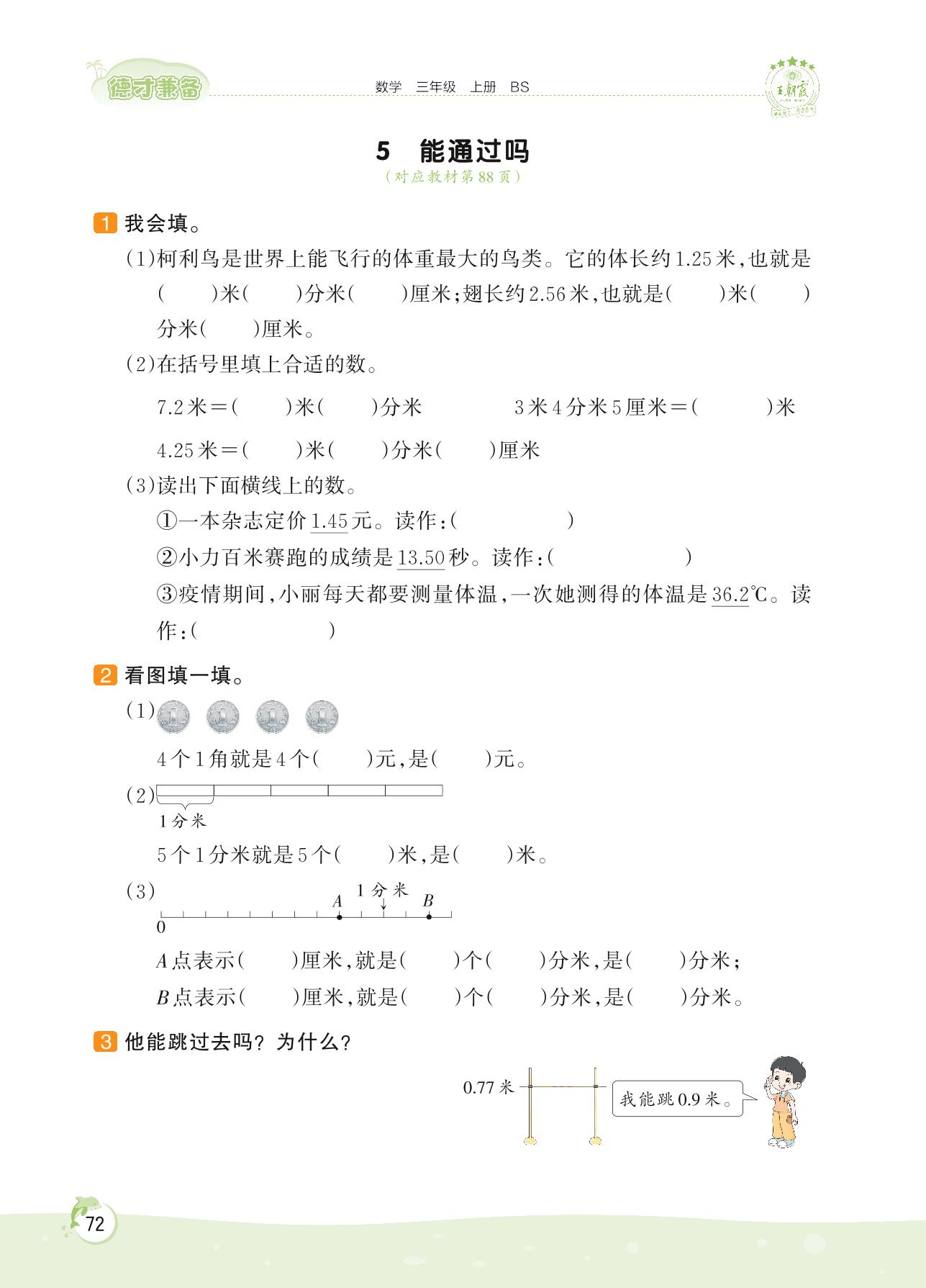 2022上册三年级数学北师版 第八单元 认识小数——5 能通过吗