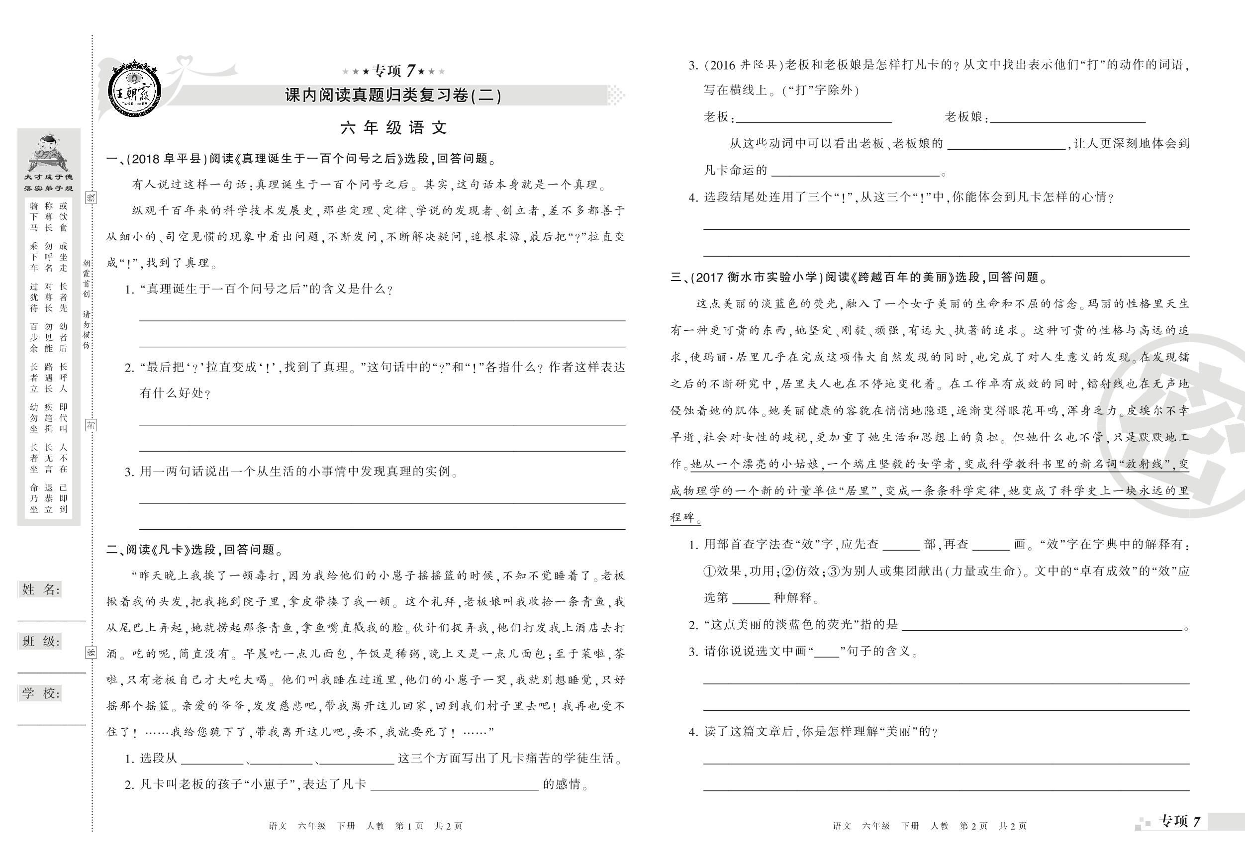 王朝霞期末专项卷——课内阅读(二)、课外阅读与写作真题归类复习卷六年级下册语文(人教版)_R21080235951【0】