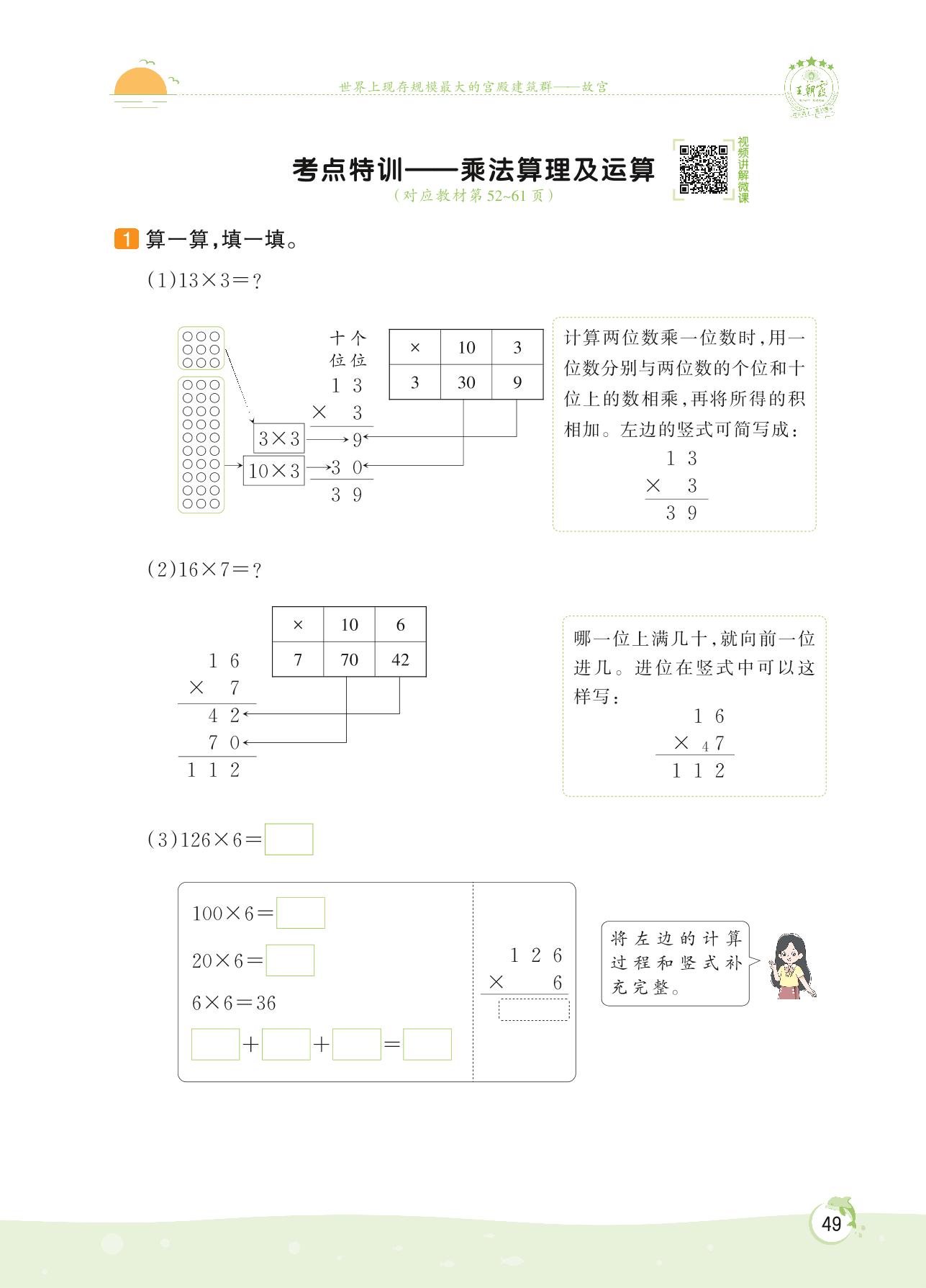 2022上册三年级数学北师版 第六单元 乘法——考点特训 乘法算理及运算