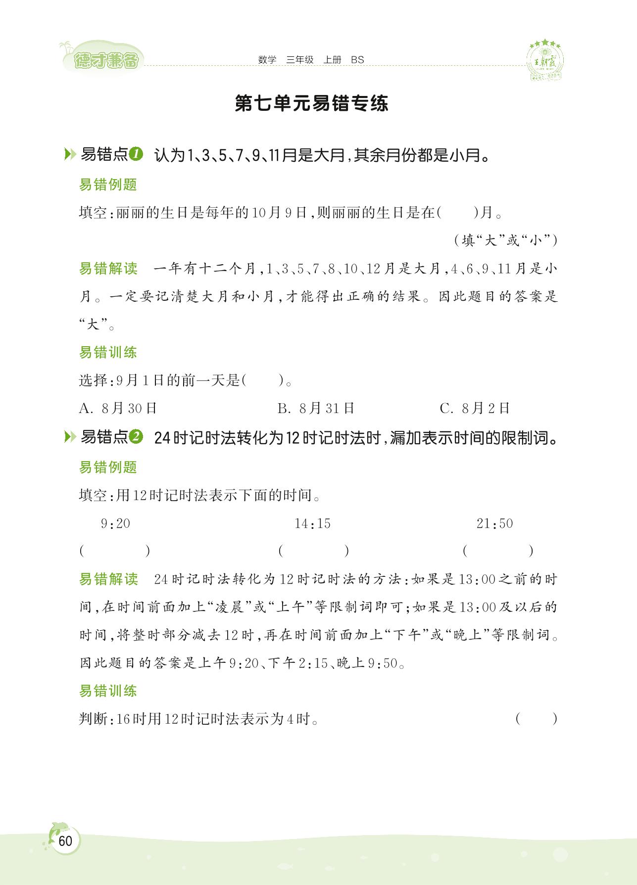 2022上册三年级数学北师版 第七单元 年、月、日——第七单元易错专练
