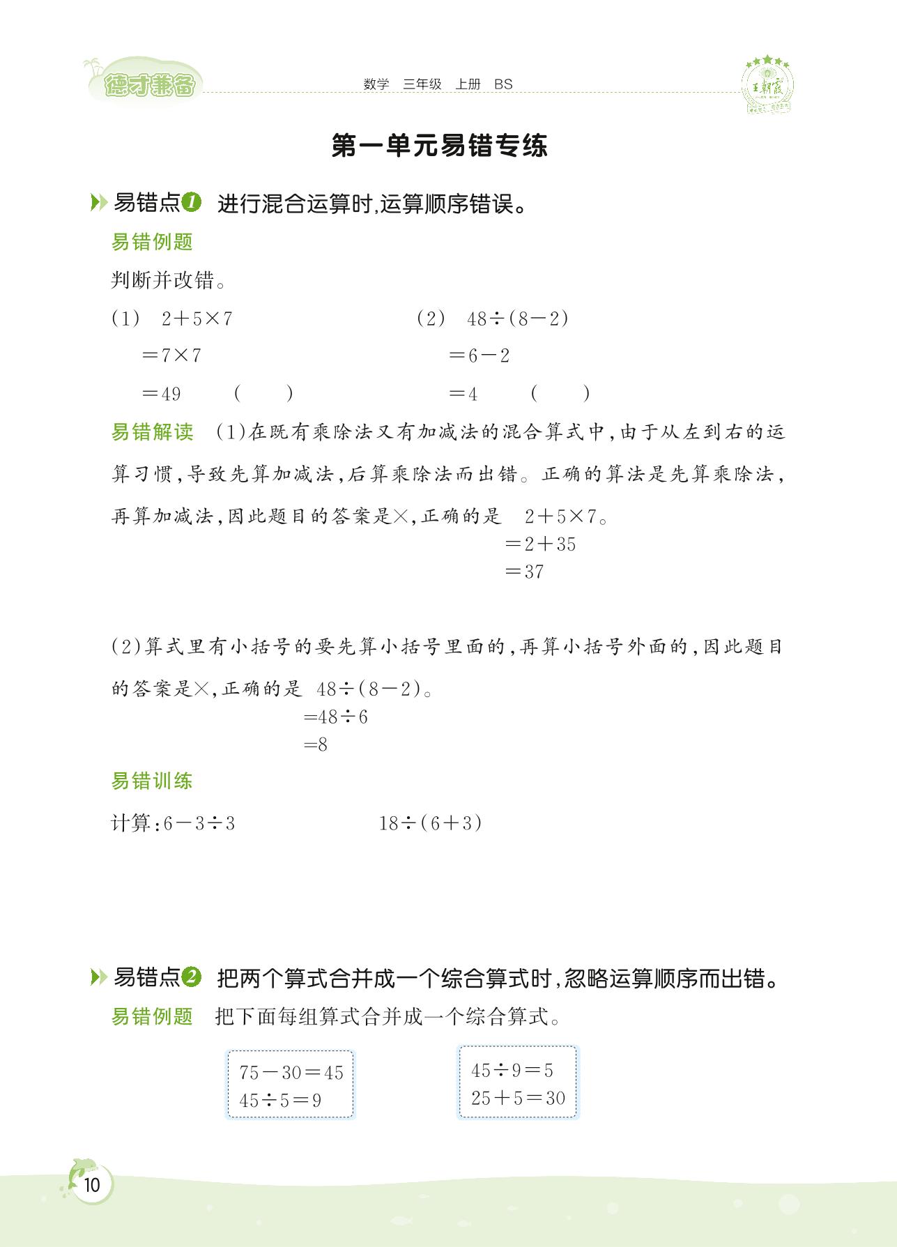 2022上册三年级数学北师版 第一单元 混合运算——第一单元易错专练
