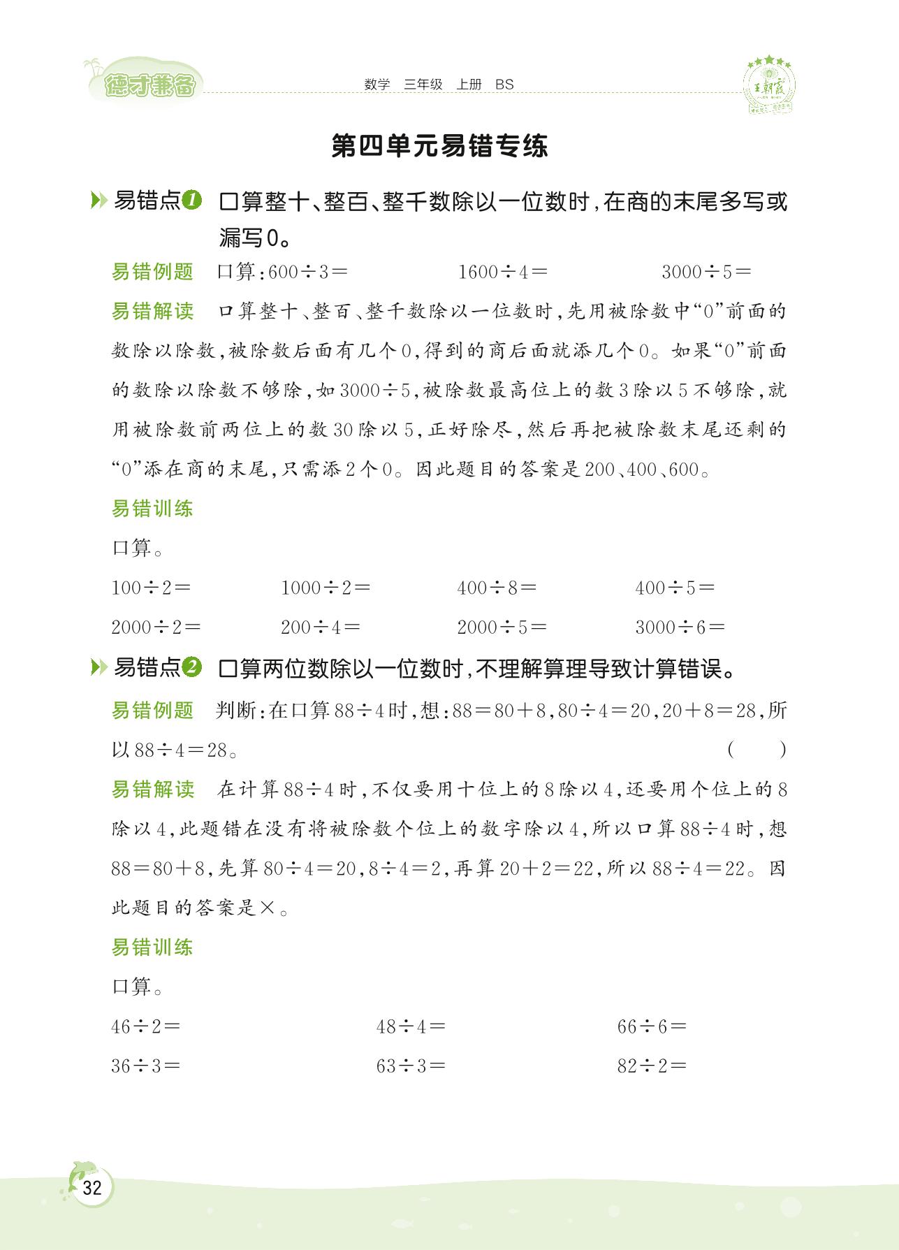 2022上册三年级数学北师版 第四单元 乘与除——第四单元易错专练