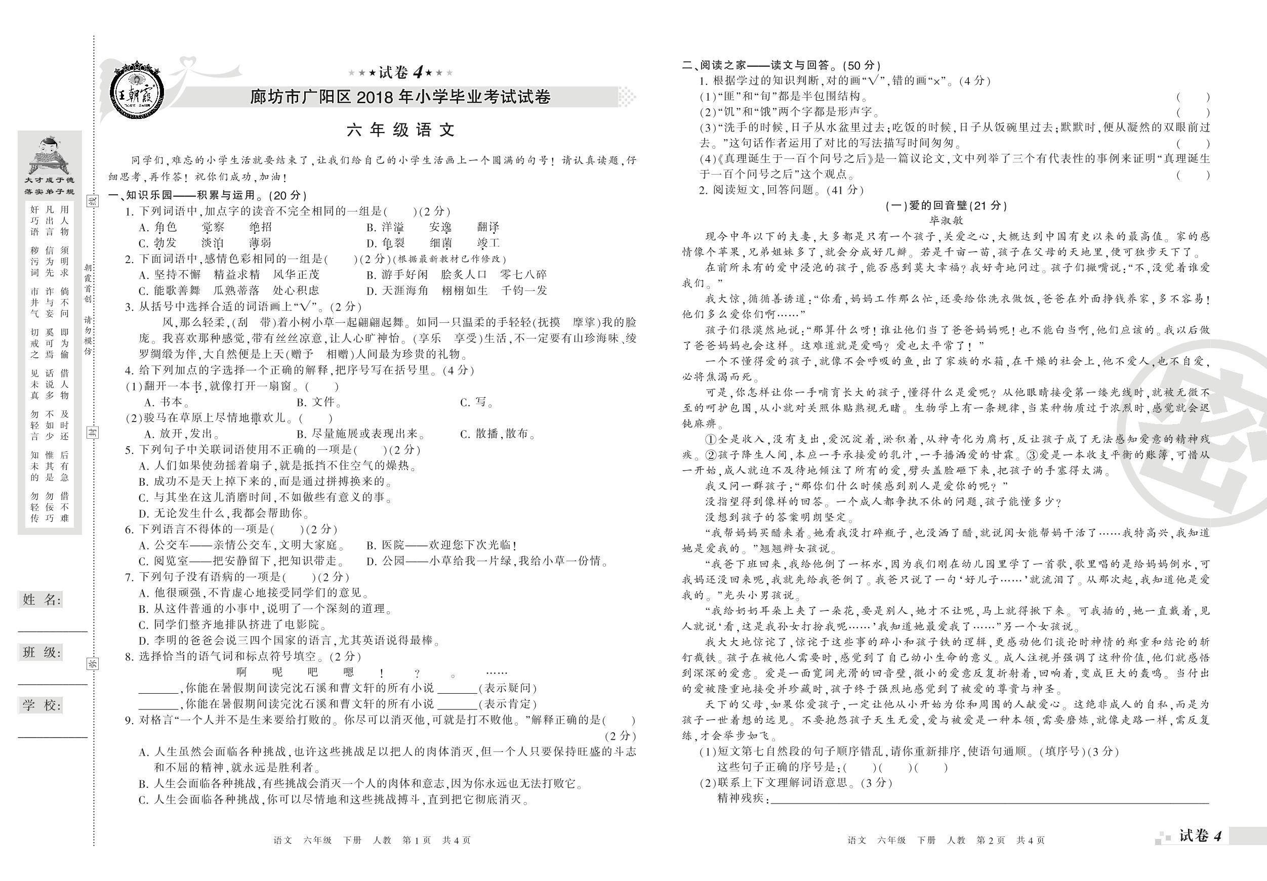 2017-2018学年第二学期廊坊市广阳区六年级语文试卷(人教版)【4】