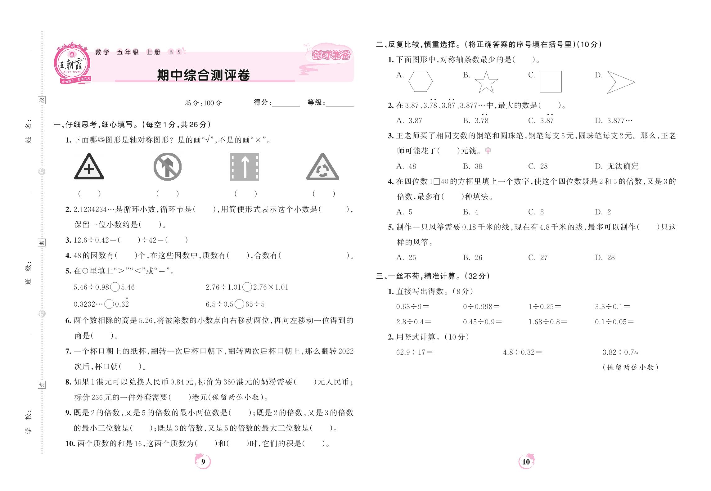 2022上册五年级数学北师版 期中综合测评卷