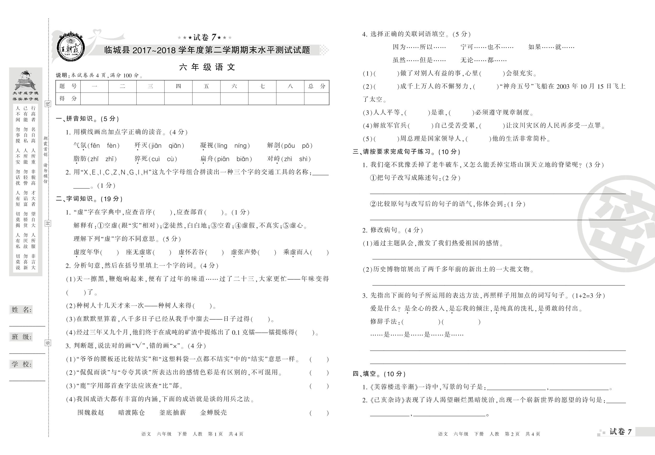 2017-2018学年第二学期邢台市临城县六年级语文试卷(人教版)【7】