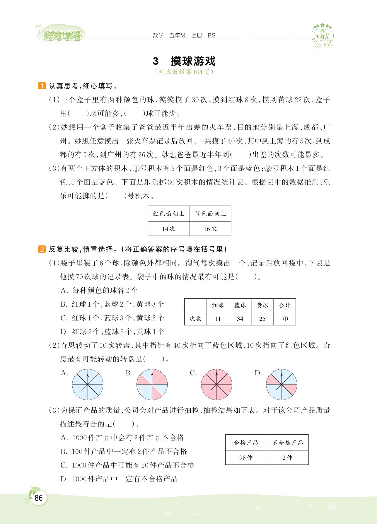 2022上册五年级数学北师版 第七单元 可能性——3 摸球游戏