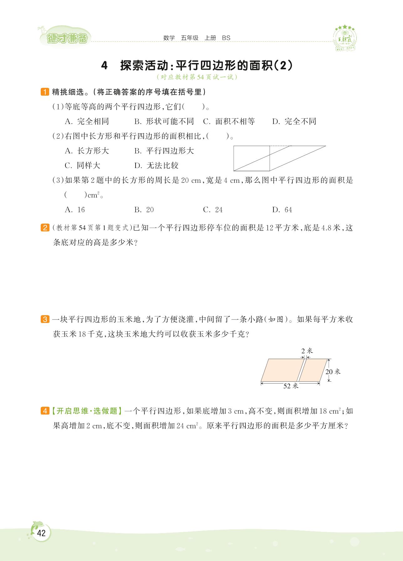 2022上册五年级数学北师版 第四单元 多边形的面积 ——4 探索活动:平行四边形的面积(2)