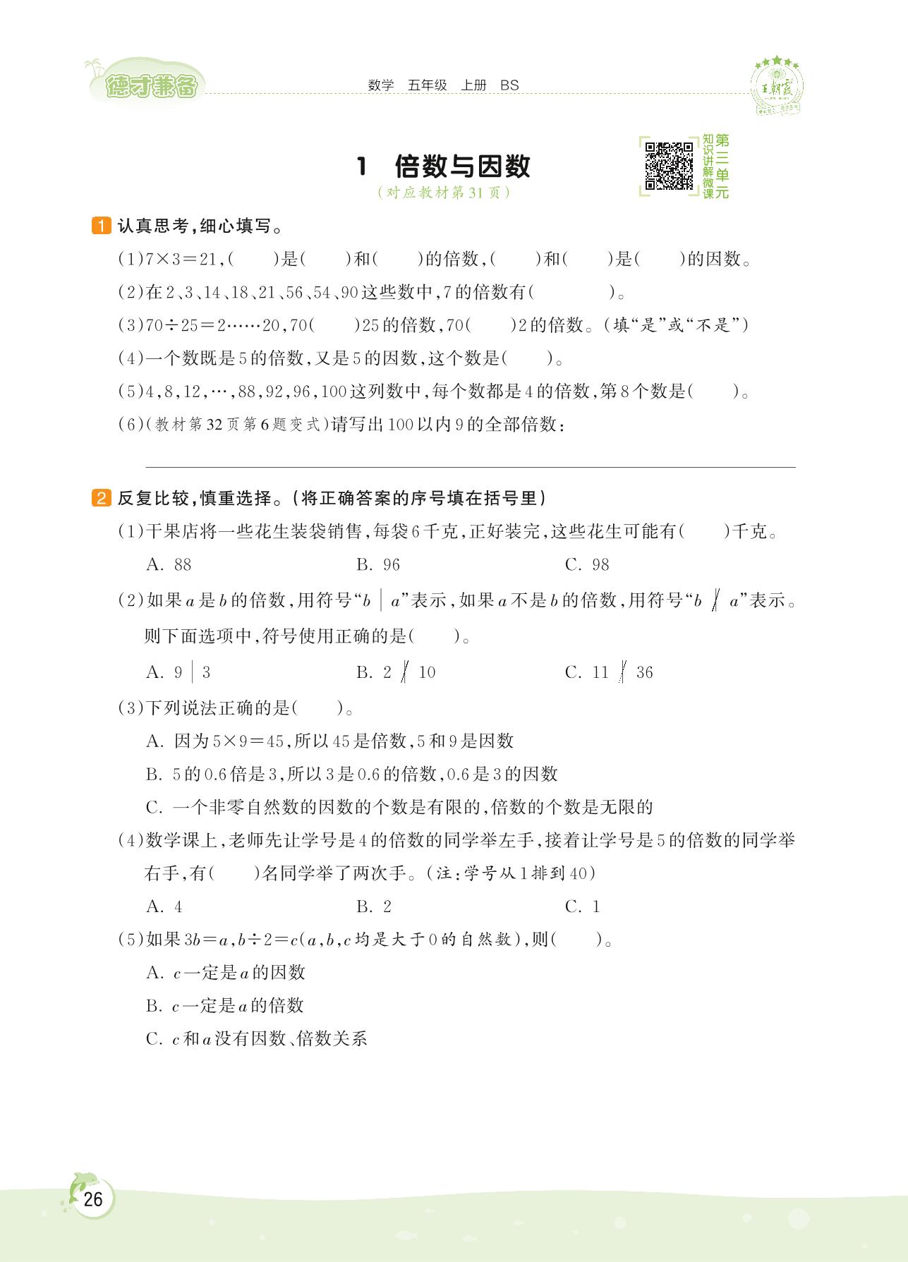 2022上册五年级数学北师版 第三单元 倍数与因数——1 倍数与因数