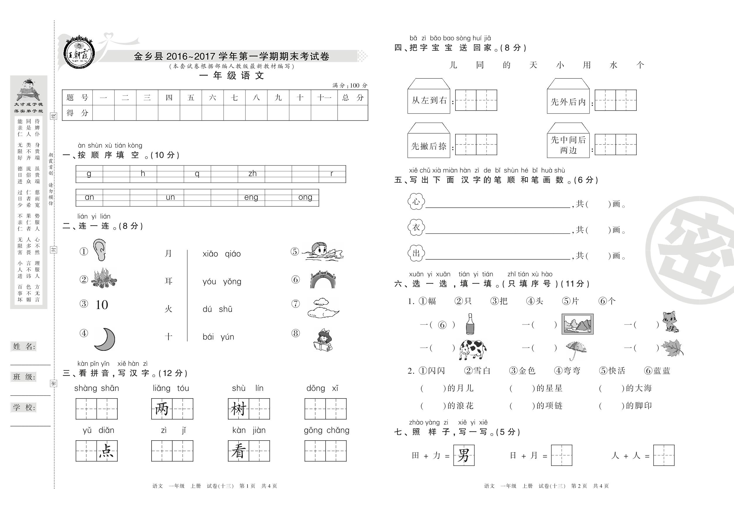 2016-2017学年第一学期济宁市金乡县一年级语文试卷(人教版)【13】