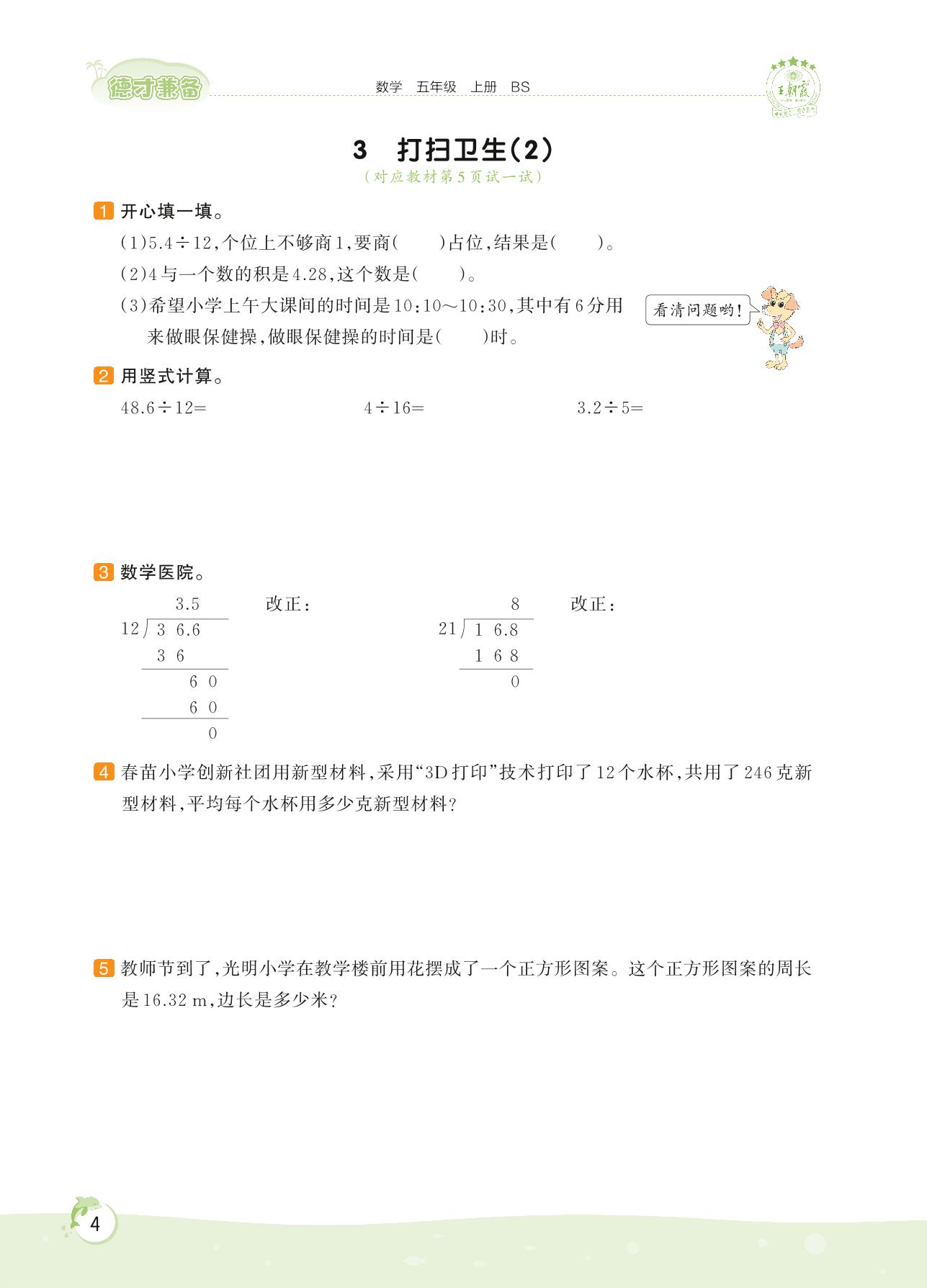 2022上册五年级数学北师版 第一单元 小数除法——3 打扫卫生(2)