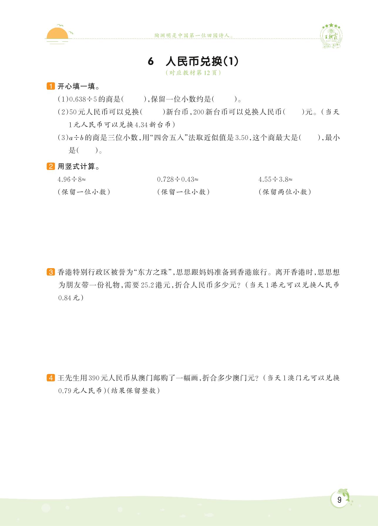 2022上册五年级数学北师版 第一单元 小数除法——6 人民币兑换(1)