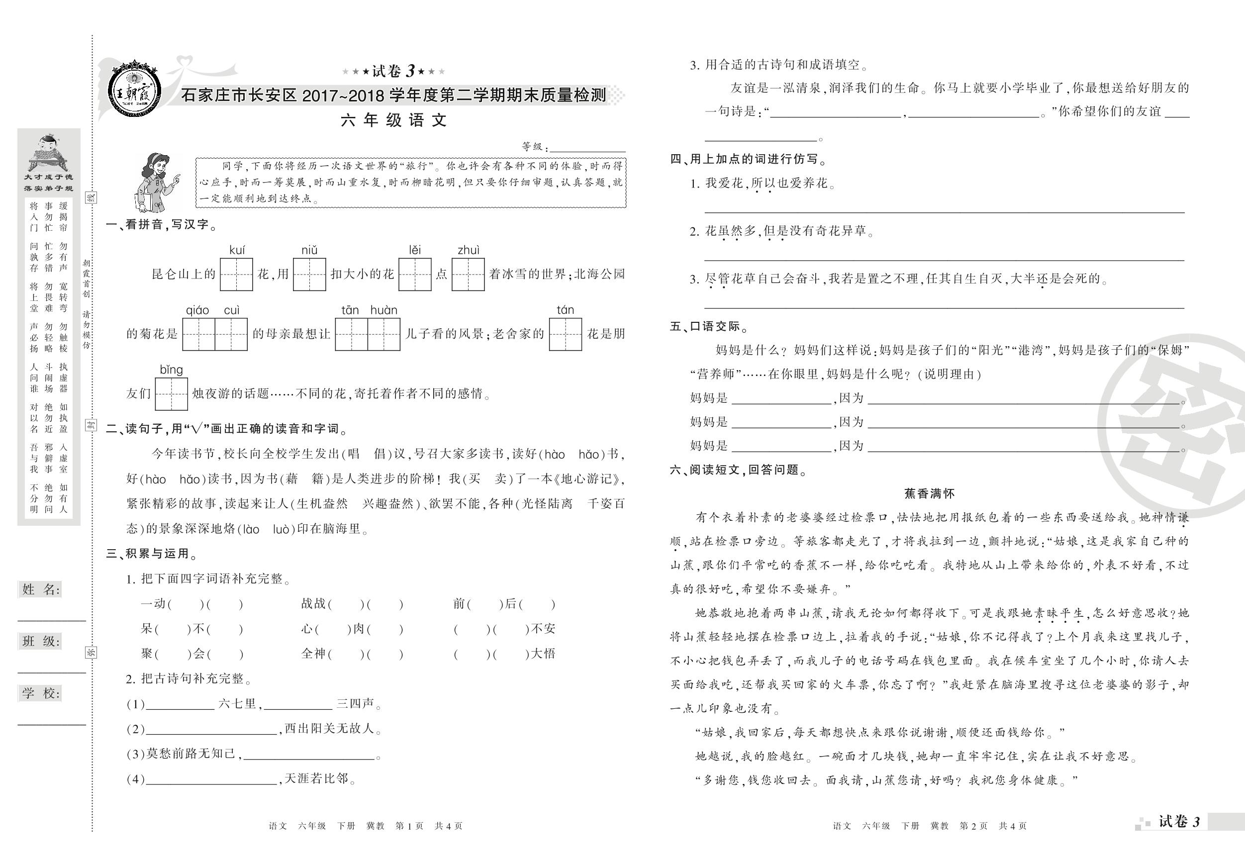 2017-2018学年第二学期石家庄市长安区六年级语文试卷(冀教版)【3】