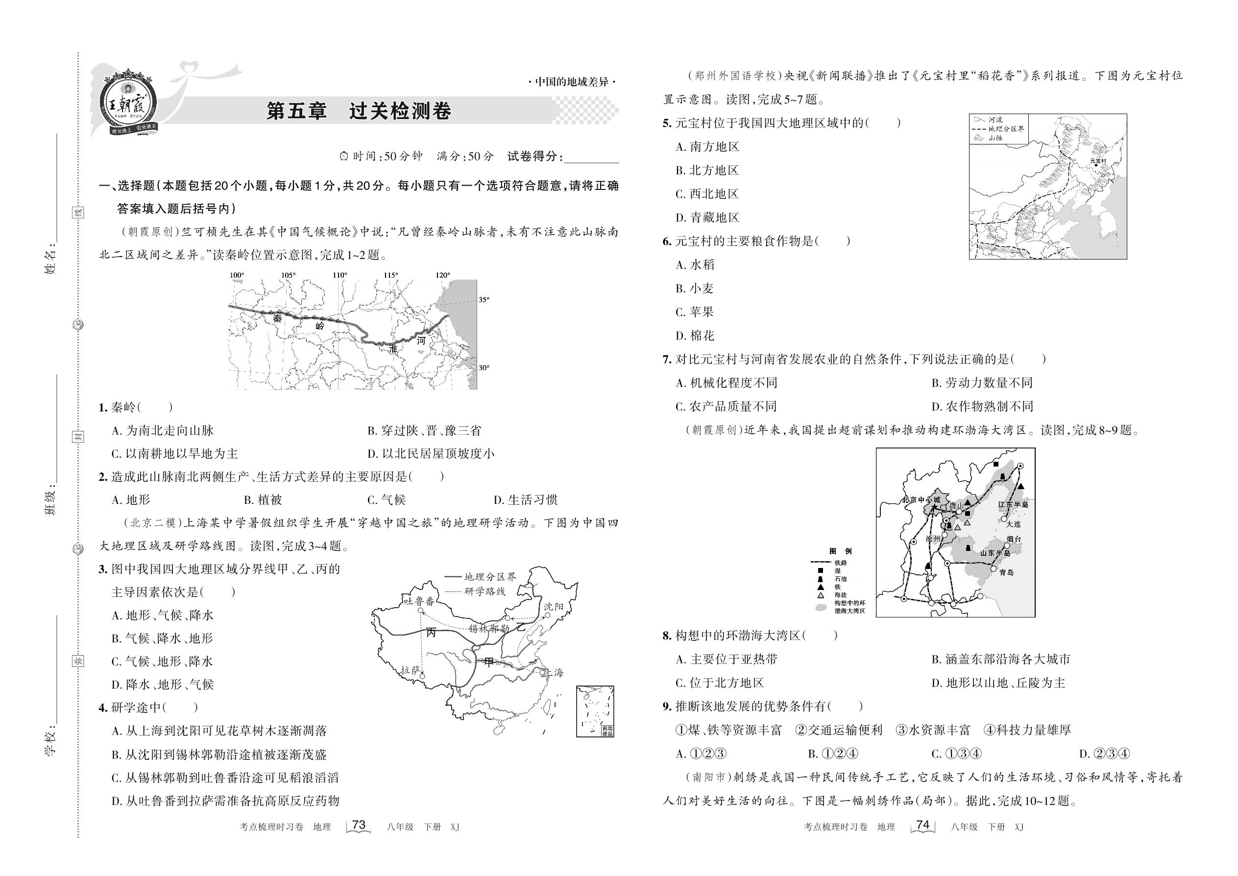 2023下册八年级地理湘教版 第五章 过关检测卷