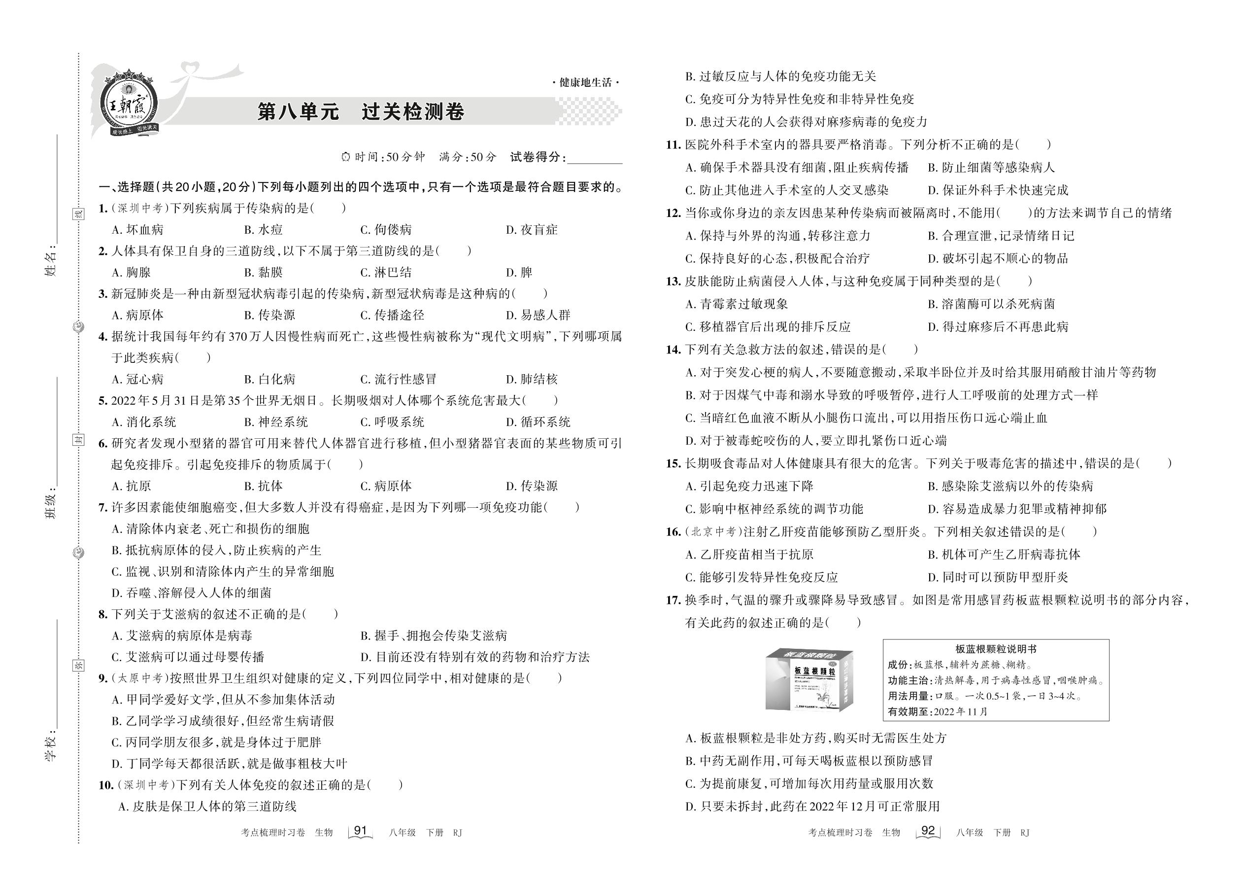 2023下册八年级生物人教版 第八单元 过关检测卷