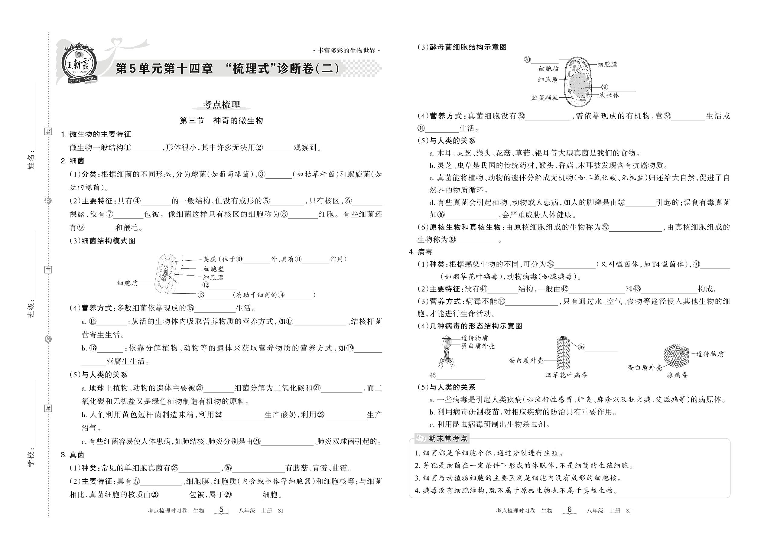 2022上册八年级生物苏教版 第5单元第十四章 “梳理式”诊断卷(二)